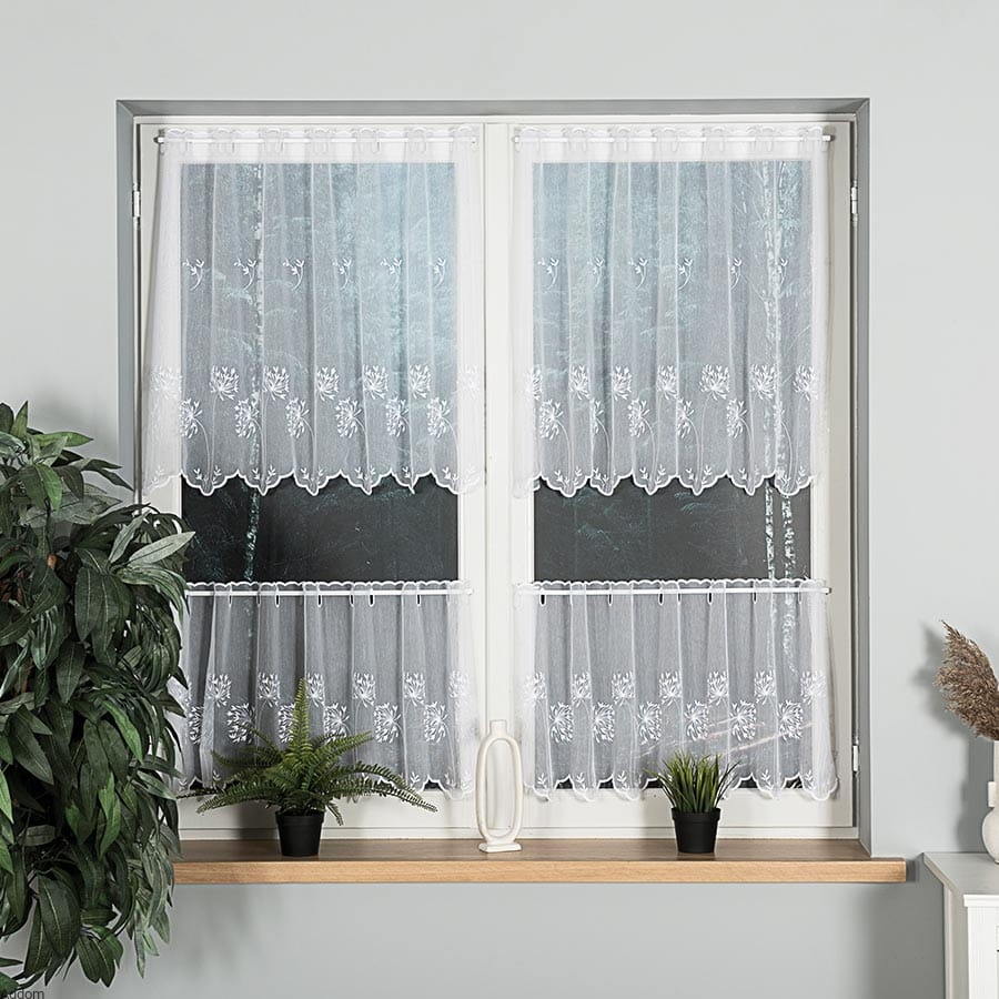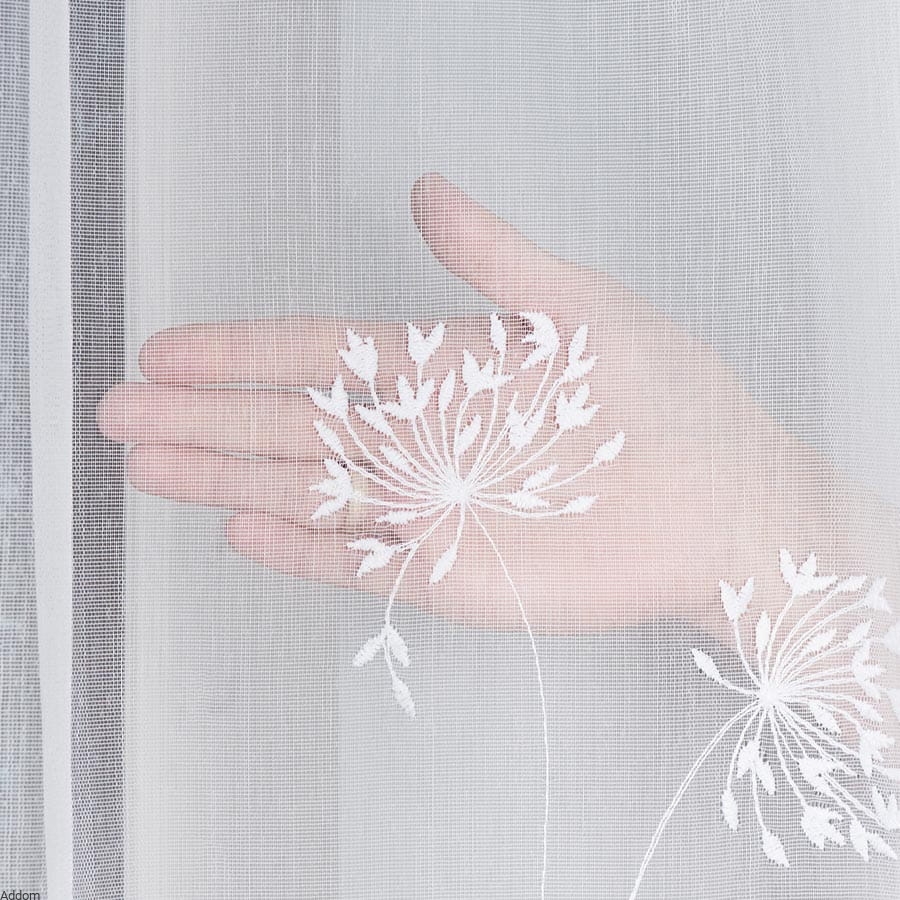 Zazdrostki w kolorze śnieżnej bieli lub ciepłego odcienia ecru, z błyszczącym bieluteńkim lub waniliowym haftem, którego jest dużo i mocno rzuca się w oczy. Wzory są abstrakcyjne, są to nieregularne wstążeczki. Całość tworzy bardzo ekskluzywne krótkie firany haftowane do eleganckich pomieszczeń kuchennych lub innych pomieszczeń, które chcemy pięknie udekorować. Tkanina, na której wyhaftowano te piękne, duże kwiaty baldaszkowate, być może dmuchawce? to siateczka przejrzysta bo bardzo wyrafinowanej strukturze.. Góra ma haftowane otworki na karnisz. Ze względu na szeroką gamę wysokości, aż do 90 cm, powstać może piękny komplet firan.