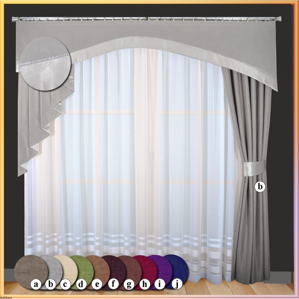 Opis produktu umieszczonego na zdjęciu: lambrekin ma wymiar użytkowy 250 cm długości, najdłuższa zasłona ma szerokość 160 cm i wysokość 250 cm, jednak ponieważ produkt jest szyty na wymiar, można podać nam dowolne wymiary. Produkty szyte na miarę wymagają dokonania przedpłaty.