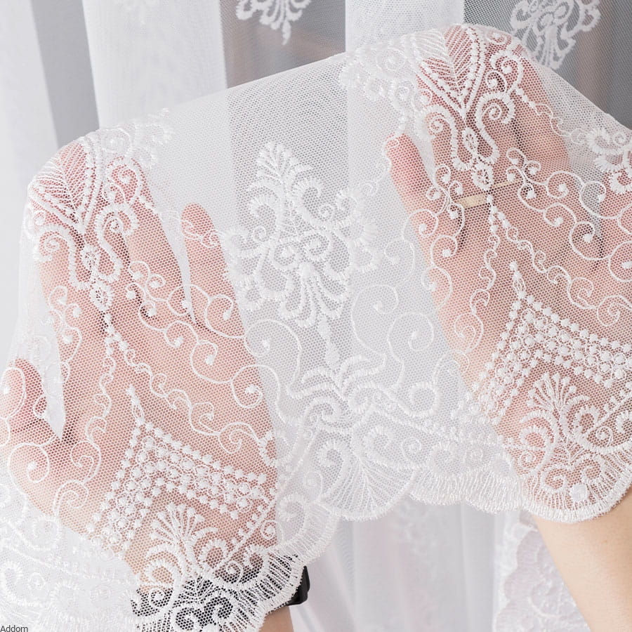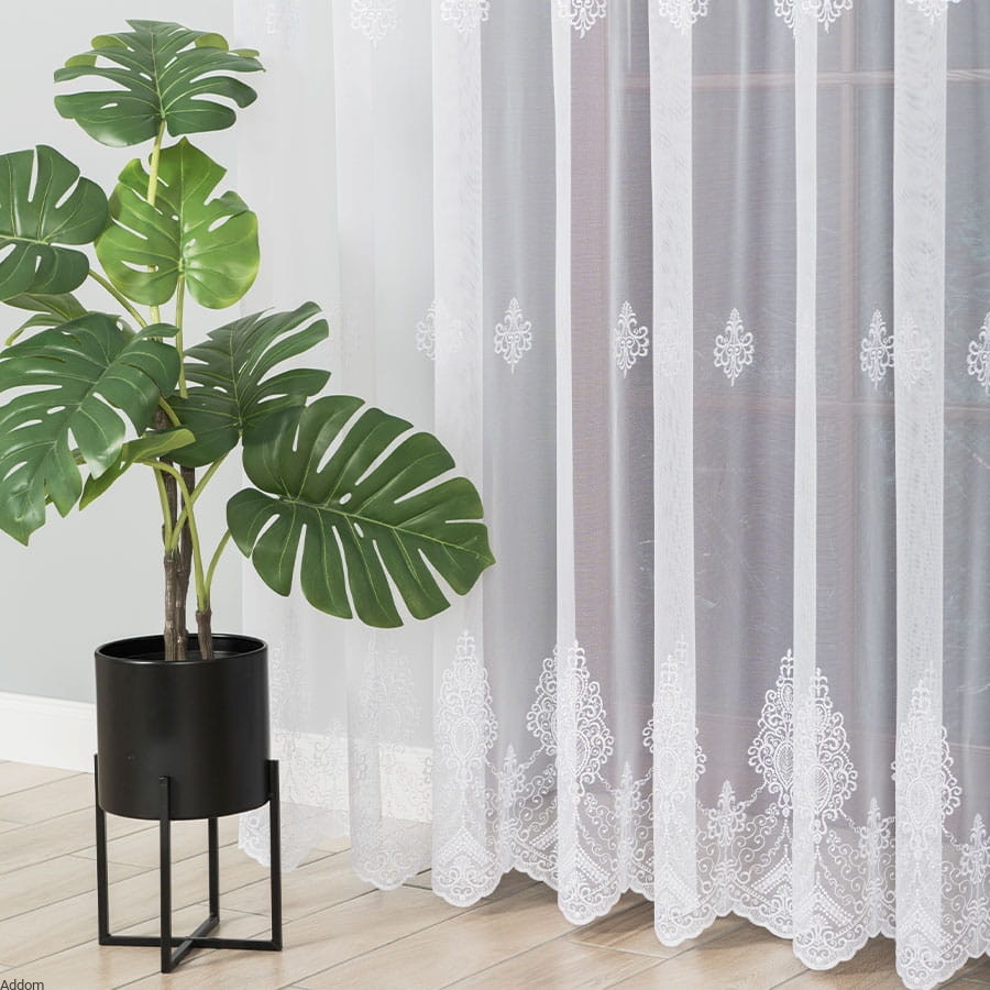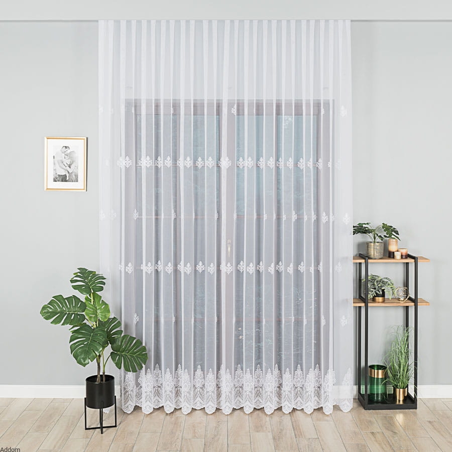 Firany o wysokości 180 lub 280cm, z gęstej siateczki typu zagęszczana markizeta typu shiny, czyli z połyskiem, z szerokimi psami haftu w stylowe wzory stylizowane na minionych epokach. Firany są bogato zdobione haftem, który wzbogacono o srebrną nić. Haft jest wypukły i bardzo gęsty, zwięzły, solidny. Wersja 180 cm ma jeden pas medalionów dołem, wersja o wysokości 280 cm ma tych rzędów dwa, z których górny kończy się na wysokości ok 104 cm od dolnego brzegu firany.