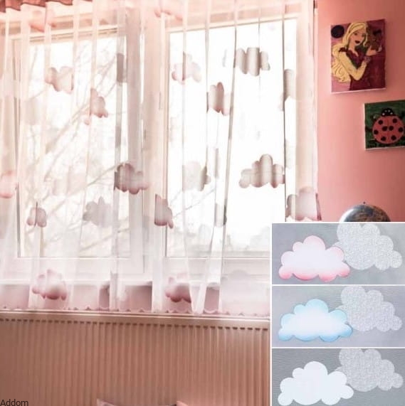 Kolorowe, różowe lub niebieskie chmurki zdobią tę piękną firanę żakardową, zaprojektowaną głównie do pokoi młodzieżowych i dziecięcych. Firanki te mają białe tło, a chmurki są błękitne lub różowe, między kolorowymi chmurkami znajdują się też białe chmurki. Wzór chmurek jest wykonany żakardem a następnie malowany wodoodpornymi farbami.