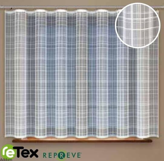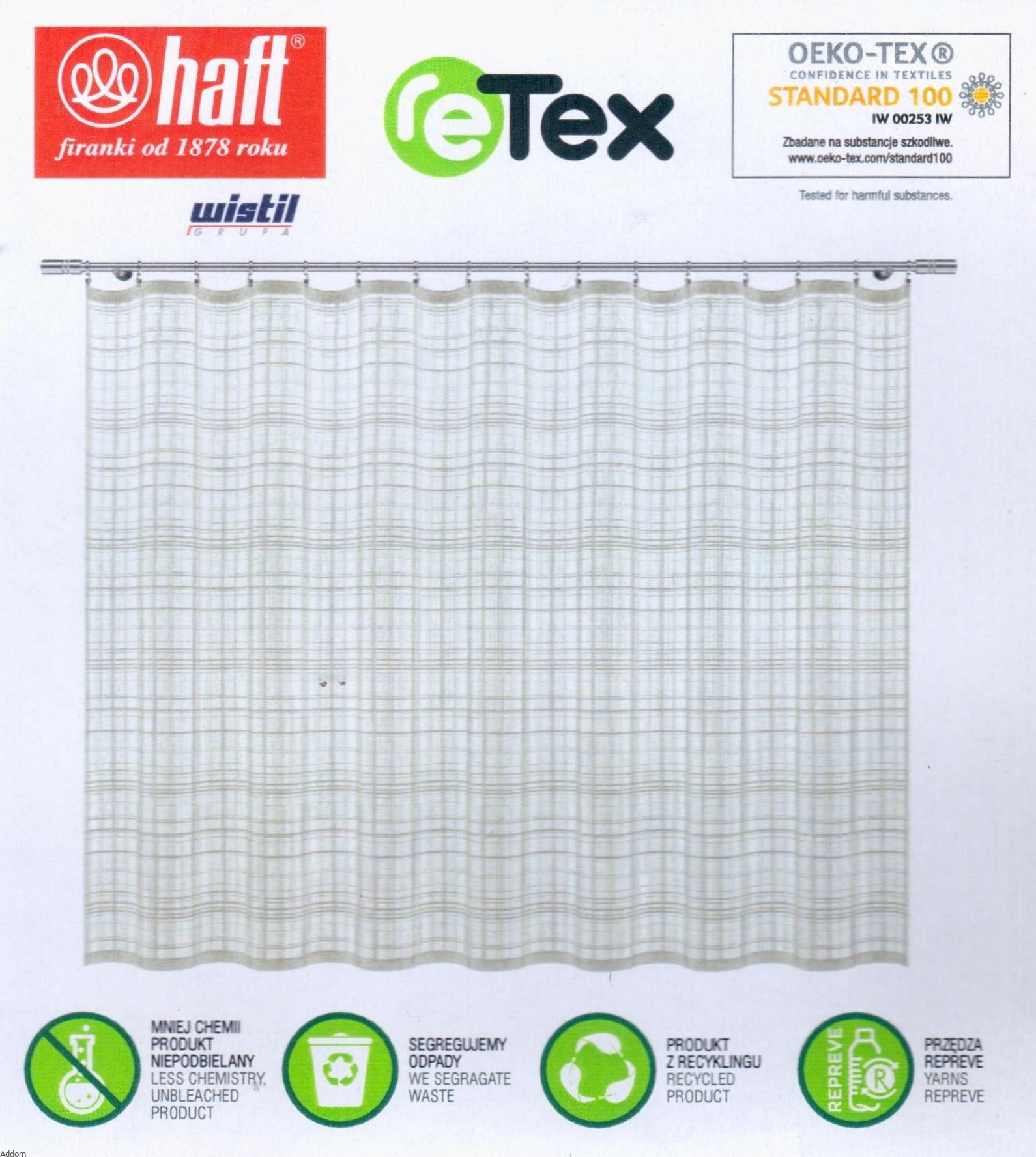 Firany gotowe w kratkę, w kolorze bardzo jasnego kremowego, który nie wynika z nadania tego koloru firanie - jest on wynikiem nie wybielania naturalnej przędzy z recyklingu, a wszystko po to, by była ona jak najbardziej ekologiczną firanką. Cała struktura firanki to kratka, dół prosty, firanka jest lekka i przewiewna, uszyta na taśmie marszczącej. Co wyróżnia tę firanę to fakt, że jest ona wykonana z nici, która powstała z odzyskanych tworzyw sztucznych, z recyklingu. Powinno to ucieszyć osoby, którym na sercu leżą sprawy ekologii i nadmiernego zużycia tworzyw sztucznych, bowiem na tę firankę nie wytworzono tworzywa sztucznego, ona powstała ze zużytych butelek pet. Firanka ta jest dość cienka, ale to ma też swój ekologiczny cel - dzięki temu, że jest cienka, nie zużyto na nią zbyt wiele materiału, a gdy kiedyś się ona Państwu znudzi, również nie będzie z niej zbyt dużo odpadu.