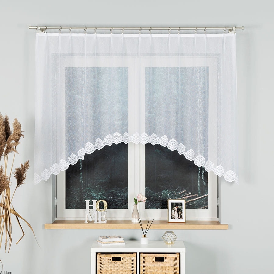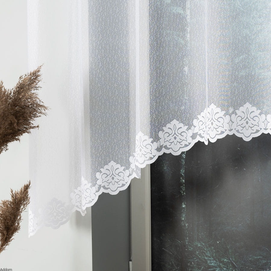 Firanki żakardowe, z taśmą lub bez taśmy, do ręcznego upinania, wykonane w formie eleganckich dekoracji okna wykończonych na dole po łuku rozetami. Tło firanki jest przejrzyste ale pokryte nieregularnymi kropeczkami, dolny wzorek bardzo biały i zwięzły, a firana nie jest rozciągliwa. Do firanki sprzedajemy też zazdrostki, które zobaczyć możecie po kliknięciu produktów powiązanych.