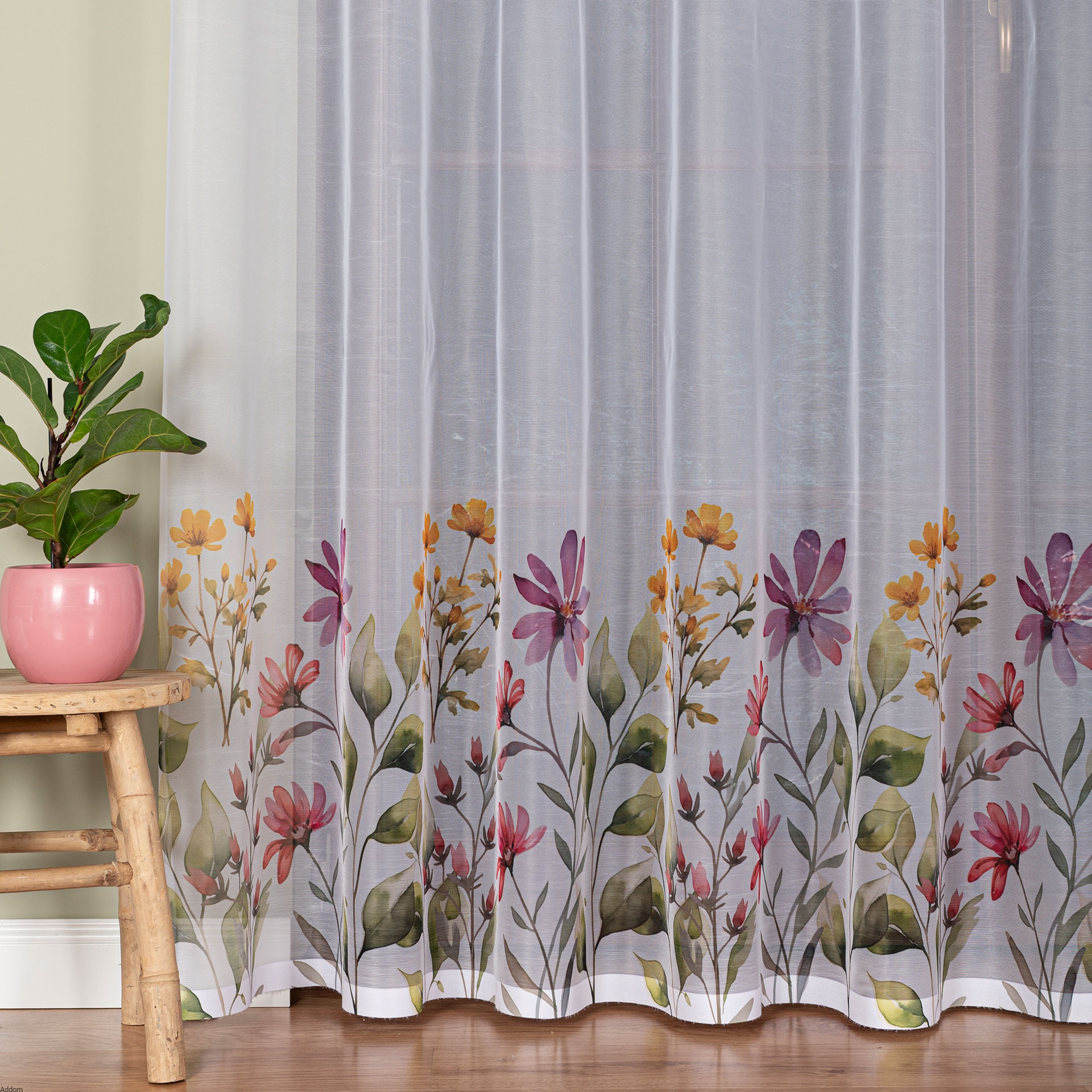 Firany o wysokości od 150 do 240 cm, żakard zagęszczany, cienki ale zwarty, o prostej strukturze, nadrukowany kwiatami i sprzedawany na metry. Wzory to duże kwiaty oraz liście, pasujące do kuchennych stylizacji. Dół wieńczy szeroki, biały pasek wzmacniająco-obciążający.