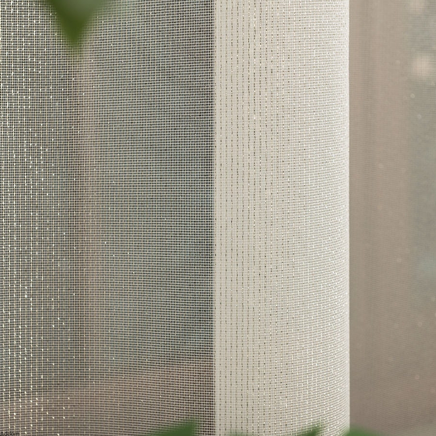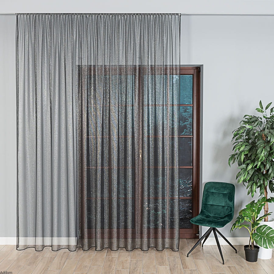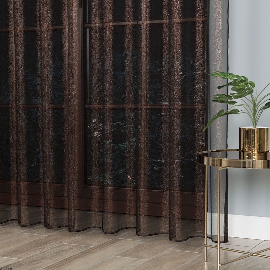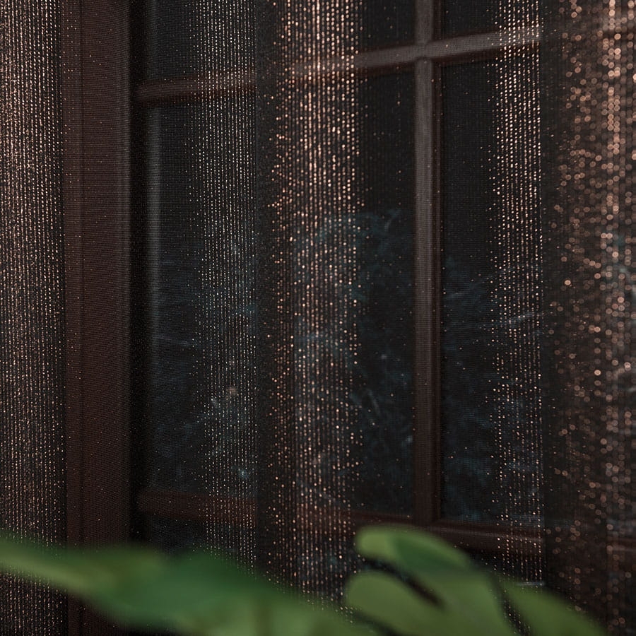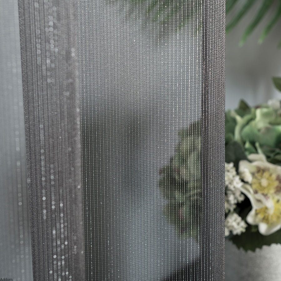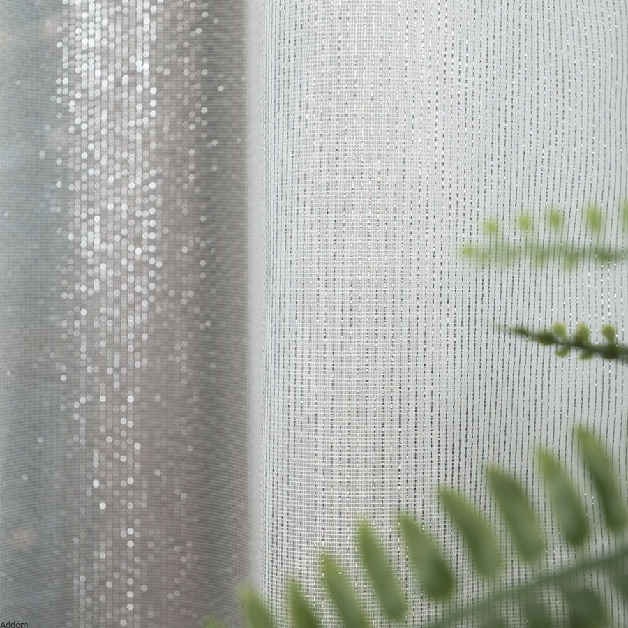 Siatka dekoracyjna na firany, ze srebrną, miedzianą lub złotą nitką, do wyboru. Firany te są minimalistyczną siatką żakardową bez określonych wzorów, jedyną dekoracją są same nici, z których jedna jest grubsza, a druga cieńsza, błyszcząca, srebrna, miedziana lub złota, kojarząca się z przepychem i zimową aurą, ale widoczna delikatnie, nie rzucająca się zbytnio w oczy, bowiem nie jest jej dużo. Dołem wszyta ołowianka.