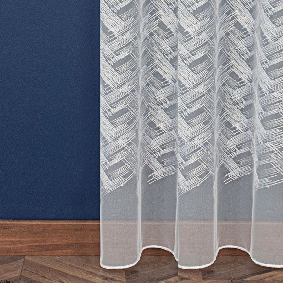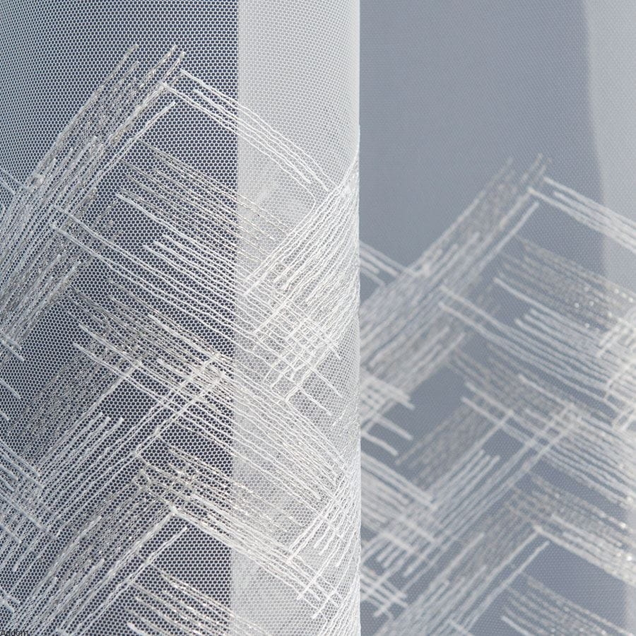 Firany z tiulu greckiego, który wygląda jak tkanina, z szerokim haftem na dole firany, ale zajmuje od znaczną jej część, w który wkomponowana jest srebrna, błyszcząca nić. Firany są niezwykle eleganckie i stylowe, a połysk i opalizująca nic nadają jej ekskluzywnego charakteru. Wzór pasuje zarówno do stylowych pomieszczeń, jak i nowoczesnych, jest bardzo uniwersalny, a w każdym przypadku nada pomieszczeniom ekskluzywnego wrażenia. Wszyta jest również taśma marszcząca.