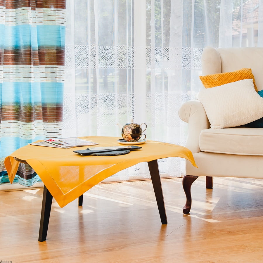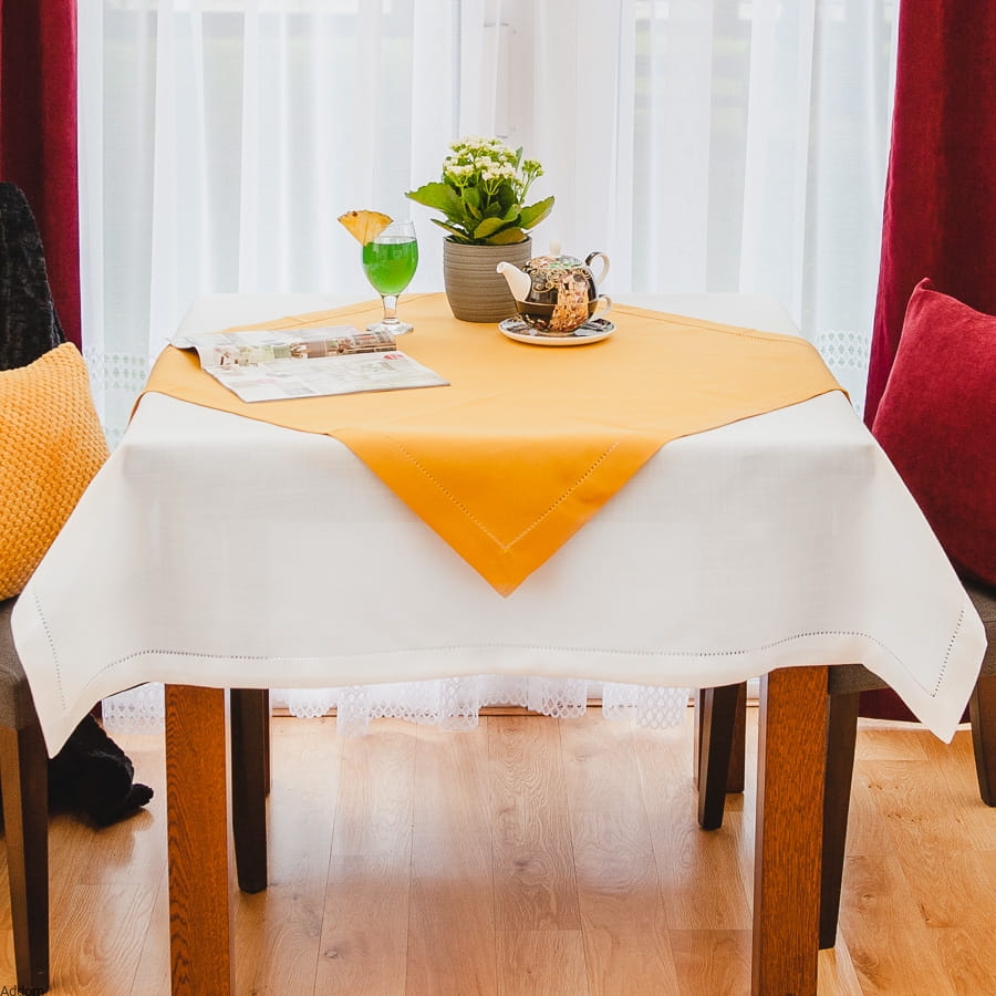 Kolorowe obrusy lniane o wymiarach 85x85, plamoodporne, o żywych, nasyconych barwach, obszywanych brzegach oraz zdobione mereżką.