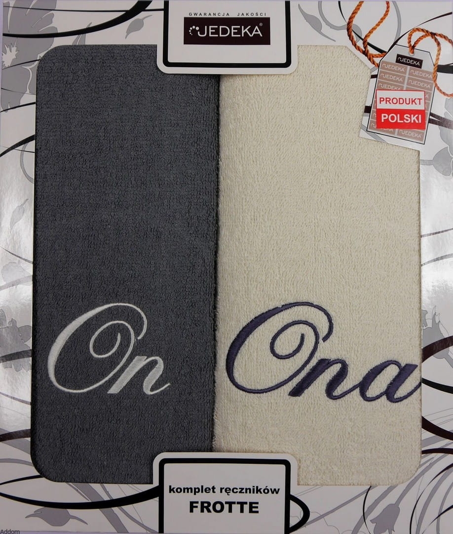 Dwa ręczniki polecane na prezent dla pary, zapakowane w dekoracyjny karton, napisy na ręcznikach są haftowane. Na każdym ręczniku znajduje się napis, określający przynależność ręcznika, aby uniknąć pomyłek - wersja dla pani jest jasna, dla pana ciemniejsza. Rozmiar każdego ręcznika to 50x90 cm, opakowanie stanowi karton z okienkiem, w opakowaniu znajdują się 2 ręczniki, stanowiące komplet.