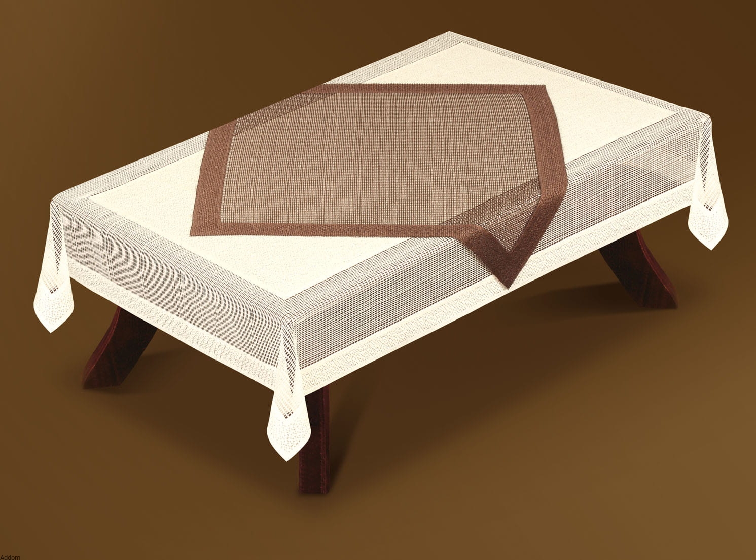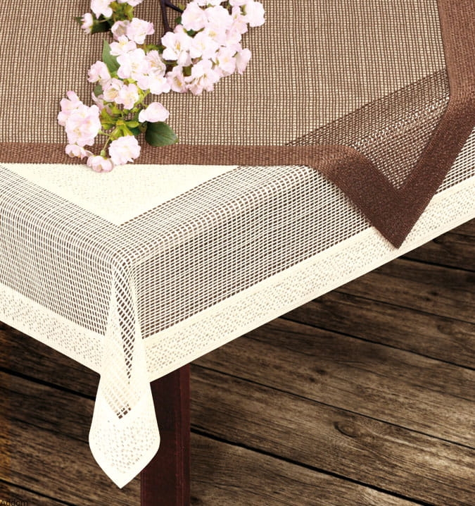 Żakardowy komplet obrusów, który stanowi obrus w kolorze kremowym plus nakładka brązowa.