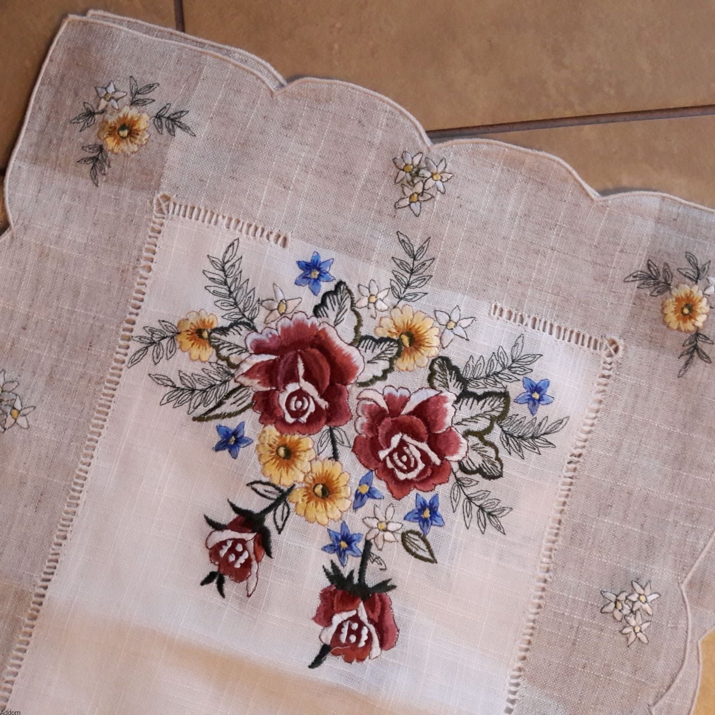 Lniane serwety z tkaniny lnianej, która po obrysie jest beżowa, wyszywane kolorową nicią w kwiatki czerwone, żółte i chabrowe, z zielonymi łodyżkami. Brzegi serwetek ładnie falowane, obszyte nicią w formie płaskiego haftu. Rozmiar 40x40 (została ostatnia sztuka) lub 30x50, a większe formy - bieżniki - można znaleźć w dziale bieżników. Dodatkowym haftem, prócz płaskiego, tworzącego kwiaty, jest haft mereżkowy, tworzący specyficzne dziurki naokoło wyszywanej części serwet.