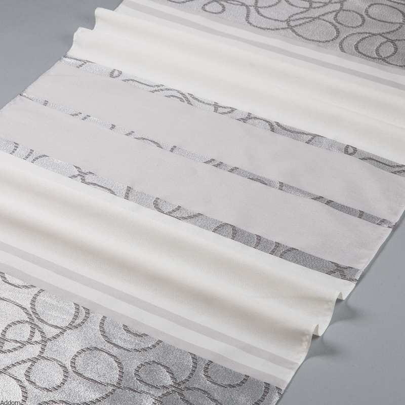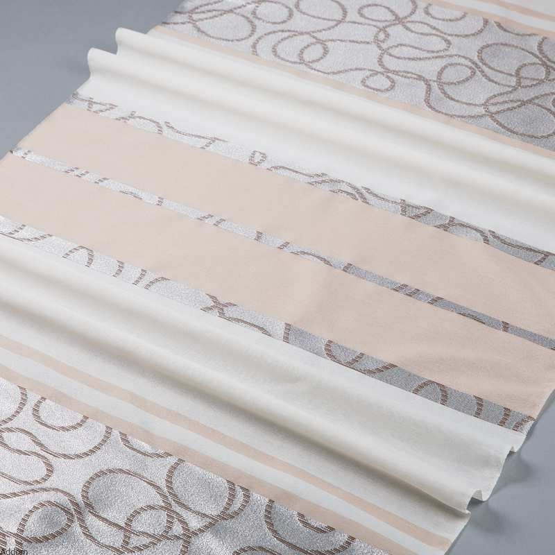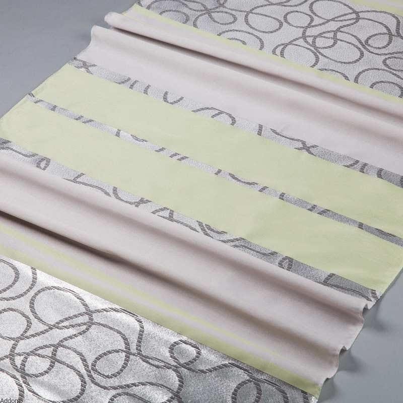 Materiał w pasy i umieszczone w nich kółeczka o przeciwstawnym kolorze. Tło w każdej wersji jest srebrne. Ten jasny, srebrny pas przeplata się z pasem kolorowym, na jasnym pasie znajdują się kółeczka wyglądające jak rysowane kredką w formie spiralek. Tkanina na zasłony ma praktyczną szerokość 150 cm, jest miękka, nierozciągliwa, jednak ze względu na pasowy fason, sugerujemy zakup kilkunastu centymetrów więcej, aby przyciąć story tak, by każda stora zaczynała się od takiego samego pasa i wzoru, a ponieważ każdy potrzebuje inną wysokość, na różnych pasach zakończą się zasłony i należy to skorygować. Aby to Państwu zobrazować podamy przykład: zasłony o wysokości 235cm ich linia cięcia przypadnie w środku pasa z kółeczkami. Jeśli chcemy, by był ten pas cały, musimy przesunąć linię cięcia górą niżej, robiąc pas jednolity cieńszy aby zyskać cały pas kółeczek dołem. Nie zawsze się nam zgra, że wszystkie pasy wypadną idealnie w całości, to wszystko zależy od wysokości docelowej zasłon, dlatego zalecamy zakup 20-40cm więcej niż potrzeba, jeśli zależy Państwu na precyzyjnym dopasowaniu nietypowej długości. Pozostające resztki można potem wykorzystać na wiązania (20cm) lub poszewki (jeśli zostanie 42cm materiału) albo obszycia dekoracyjne.