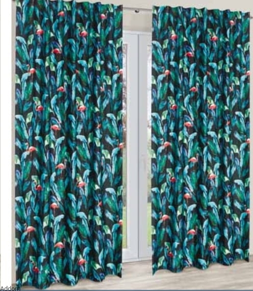 Materiał na zasłony w pomarańczowe flamingi i zielone liście egzotycznych pnączy lasów strefy tropikalnej, o szerokości 155 centymetry. Tkanina ma czarne tło i mocno kolorowe, nasycone wzory w kontrastujących kolorach zieleni i pomarańczowego. Jednokolorowe tkaniny można użyć by dopełnić aranżację.