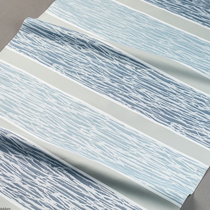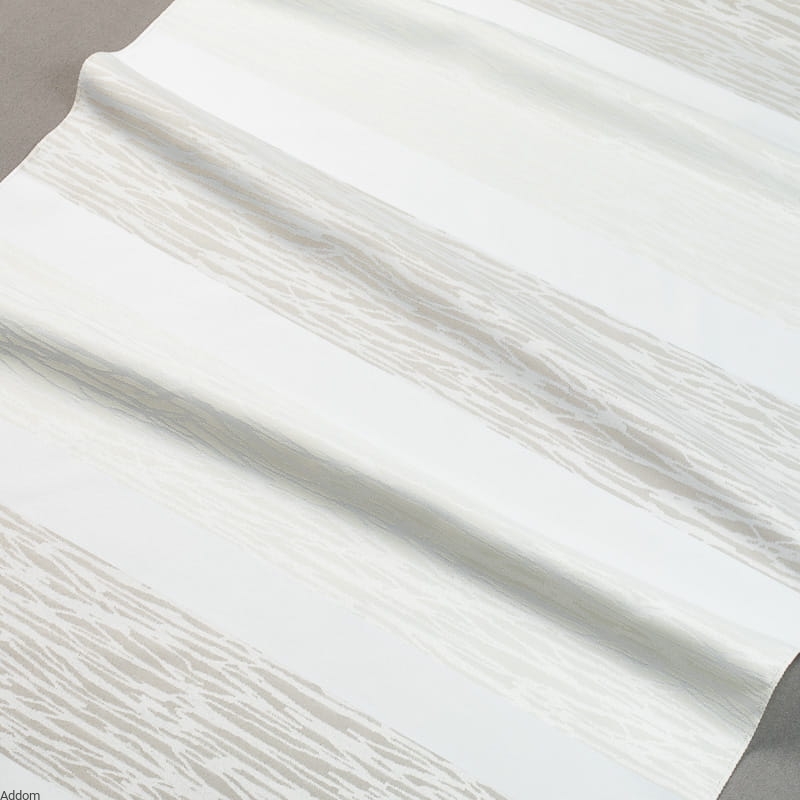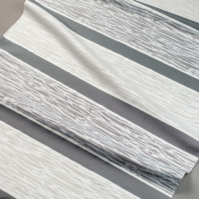 Materiał poliestrowy w pasy, ale wyglądający bardzo naturalnie, jakby był z włókien naturalnych, ale z przeplecioną srebrną lub złotą nitką. Pasy są naprzemiennie, wąskie i szersze, między nimi znajduje się jasne tło, które tworzy trzeci rząd pasów. Bardzo stonowana kolorystyka, beżowa, niebieska, szara i grafitowa (ciemny popielaty). Szerokość tkaniny 150 cm. Szerokie pasy są wypełnione poziomymi paseczkami, paski węższe są jednolicie wypełnione kolorem.