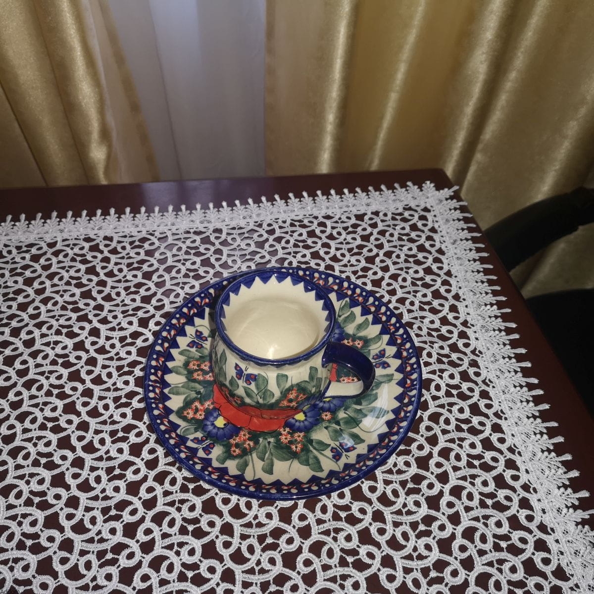 Na zdjęciach nakładki są sfotografowane na stole kwadratowym 60x60 cm (biała) oraz na stole okrągłym średnicy 60 cm (kremowa). Sprzedajemy obrus ze zdjęcia głównego, ale prezentujemy też inne wzory poglądowo, abyście mogli Państwo zobaczyć, jak taka nakładka kwadratowa prezentuje się na blatach o różnych kształtach.