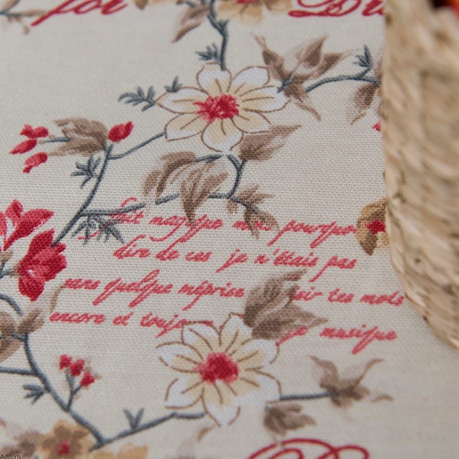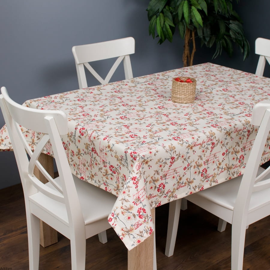 Obrusy grube, z tkaniny lniano-bawełnianej z domieszką poliestru, tak zwanego blnu, z delikatną powłoczką teflonu, aby były łatwiejsze w utrzymaniu i nie przyjmowały plam. Obrusy są podszywane. Obecnie pozostał nam jeden rozmiar, 80x180 cm w kolorze naturalnym z czerwonymi lub fioletowymi kwiatuszkami.