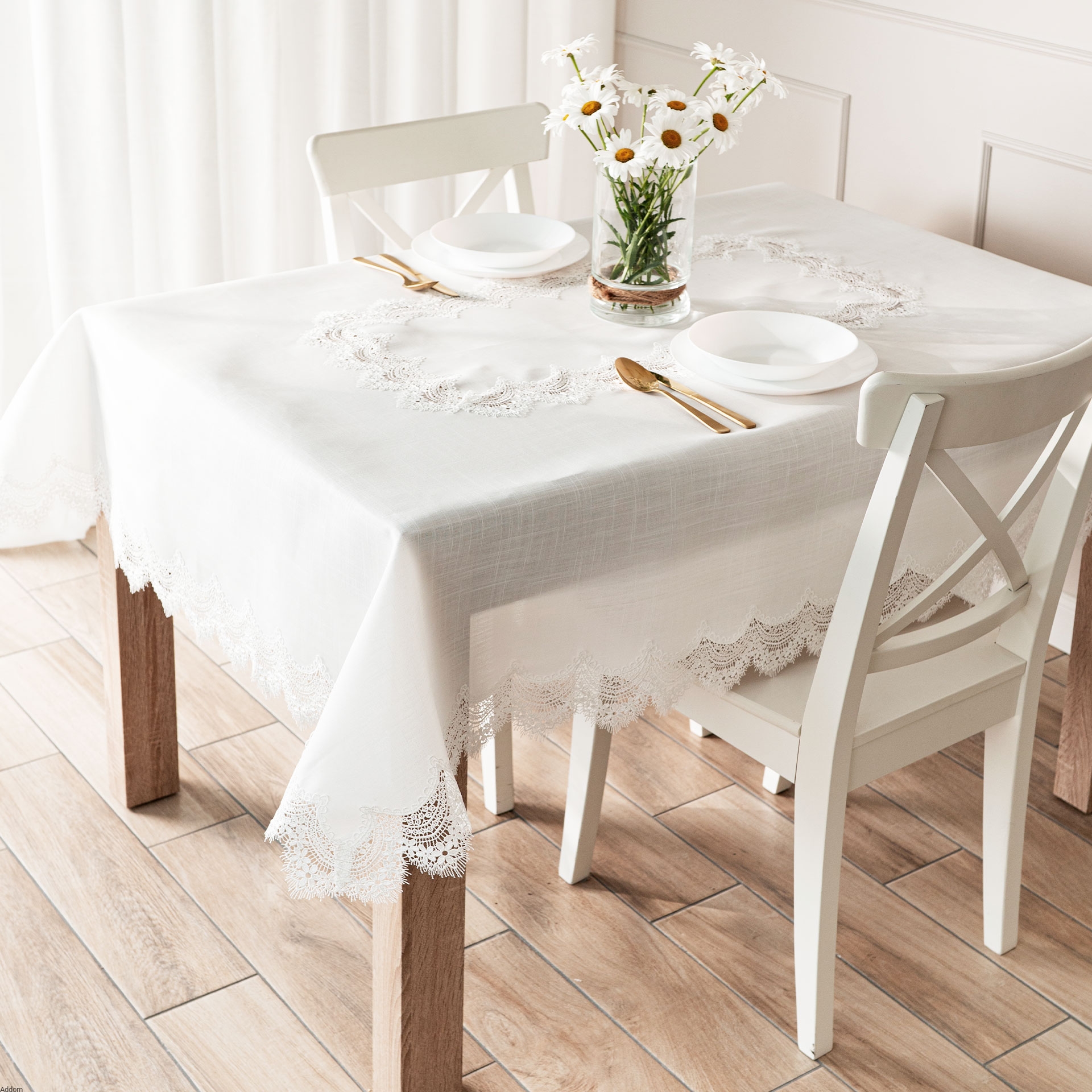 Piękną tkaninę o subtelnej strukturze lnu ozdobiono naokoło szeroką gipiurą - koronką reliefową. Taka sama gipiura wszyta jest wyżej w tkaninę, tworząc dekoracyjny bieżnik wszyty w obrus. Przez tę koronkę pięknie będzie prześwitywał stół. Tkanina użyta do szycia jest plamoodporna.