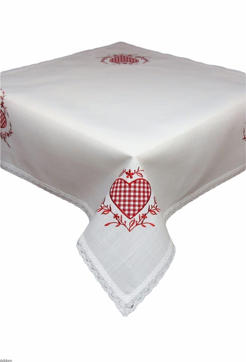 Obrusy haftowane z naszywanymi aplikacjami w serca, które są obhaftowane, aplikacją też towarzyszą kwiatowe hafty. Brzeg obrusów obszyty jest beżową tkaniną w kropeczki, z takiej samej tkaniny naszyte są serduszka w groszki. Tkanina jest jak bawełniana, jednak jest to poliester stylizowany na tkaninę bawełnianą. Oprócz obrusów tradycyjnych, z tą aplikacją w serca oferujemy również obrusy w innych kształtach oraz bieżniki. Bieżnik można zastosować na środku obrusów, aby udekorować środek stołu tą samą dekoracją.
