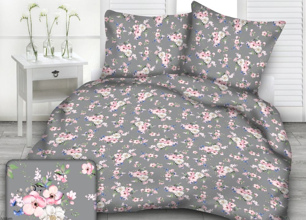 Pościel popielata z materiału bawełnianego typu flanela, o ciemnym, popielatym tle w różowo białe dzikie różyczki. Wzory to rozkwitnięte pędy krzewu dzikiej róży, wyglądające jak malowane akwarelami. Wzór ten jest z obu stron poszew, przybrał formę skupisk różyczek. Pościel gruba, ciepła, komplet pościeli to dwie poszewki 70x80 i jedna poszwa na kołdrę.