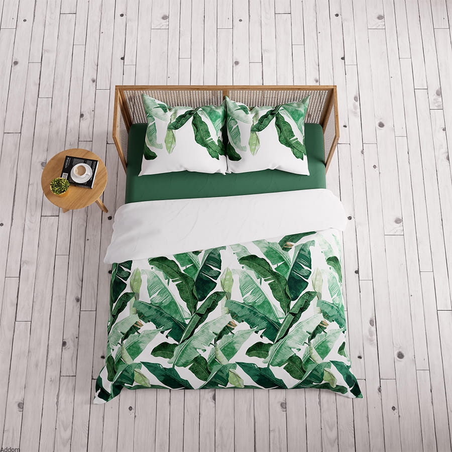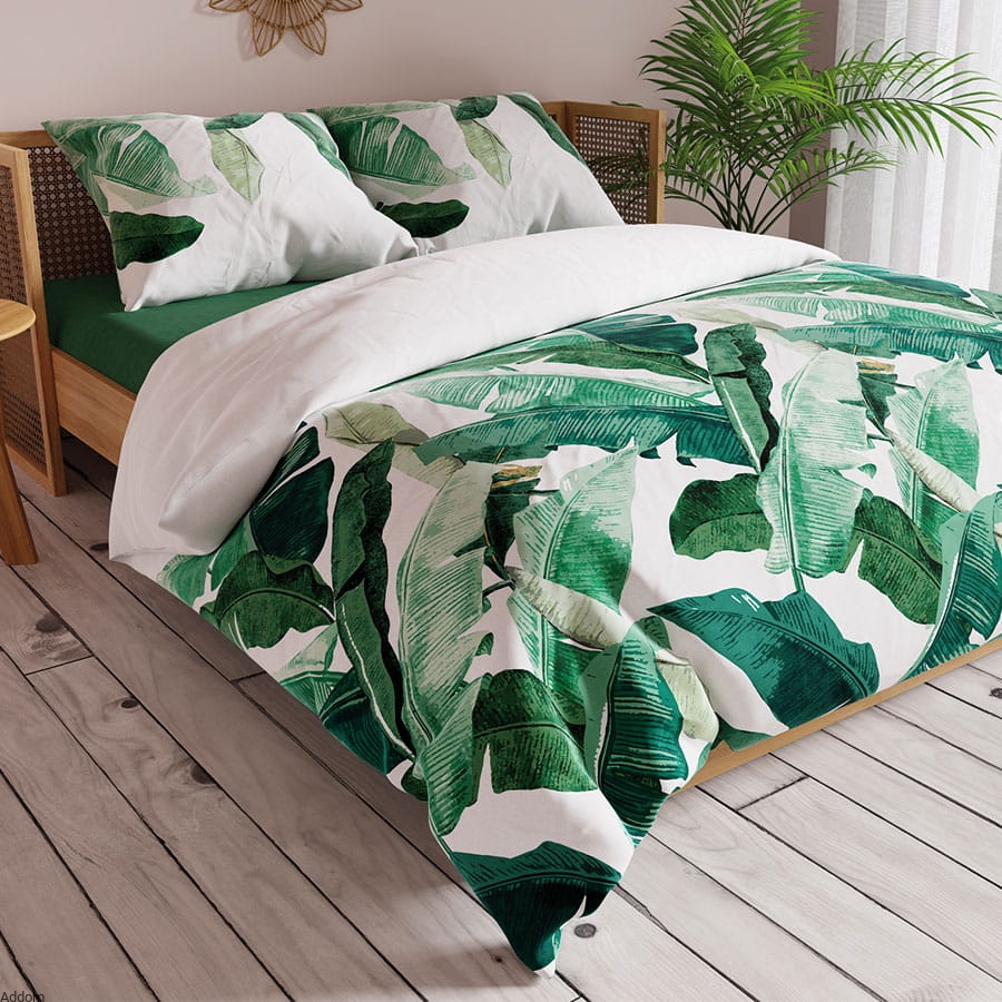 Pościel satynowa z grafiką roślinności lasu deszczowego w różnych odcieniach zieleni, z ciemnym tłem, uszyta z satyny bawełnianej, kojącej nasze zmysły podczas dotykania. Grafika będąca odpowiedzą na obecne trendy mody typu Jungle, w których tworzymy swój egzotyczny raj w domu, inspirowany dżunglą i lasami deszczowymi. Do pościeli można zakupić poszewki z papugami lub jednobarwne poszewki z satyny. Od spodu jest biała.