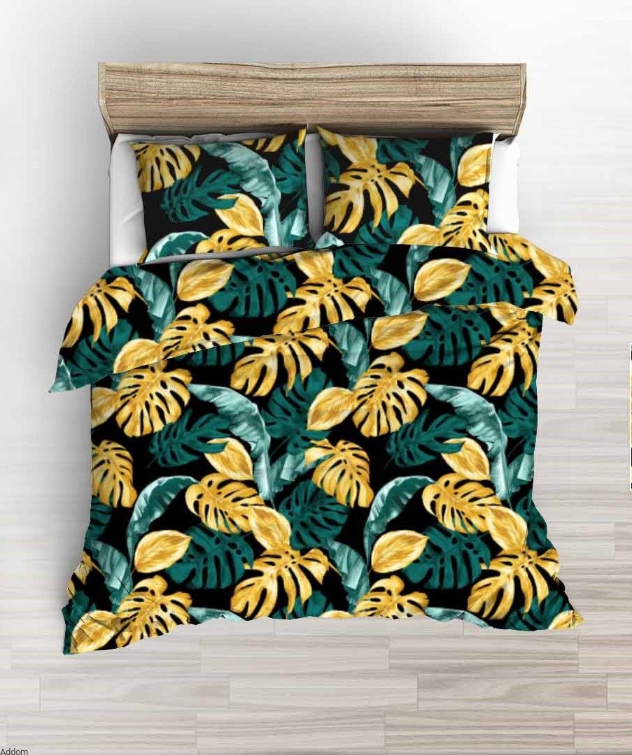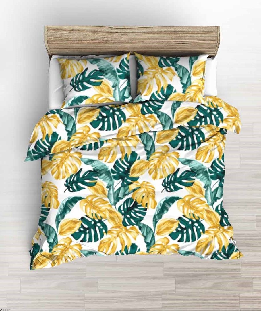 Biała pościel z kory w zielone liście egzotycznych roślin, paproci i monstery, w rozmiarze 160x200, z 2 poszewkami na poduszki, dwiema dużymi na poduszki 70x80, zaś jaśki 40x40 można kupić osobno, w cenie 6zł / 1szt.