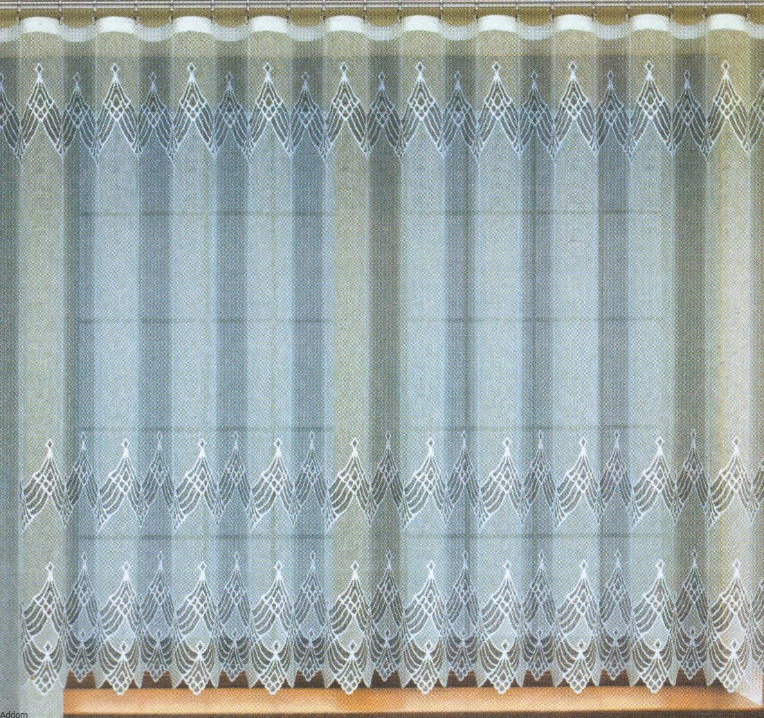 Firany wykonane z przędzy o średniej grubości, proste dołem, o wzorze eleganckim geometrycznym. Wzór ażurowy mocniej zdobi dół firan, tak samo jest górą, pod karniszem, jest tam jeszcze jeden wzór ażurowy, maskujący kąty framugi okna. Firanki krótkie i długie można komponować razem bez względu na ich wysokość, bowiem brak środkowego pasa schodzącego się na obu firanach sprawia, że nie ma obaw, że pasy się miną.