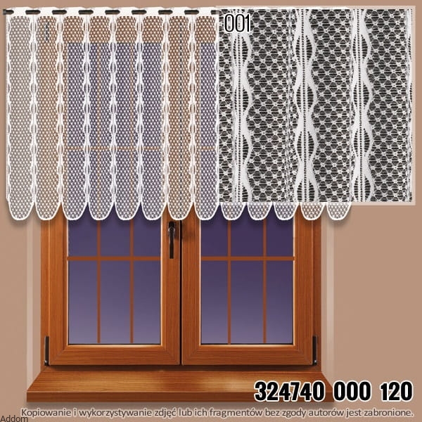 Krótkie firany o wysokościach 30, 60, 90 i 120cm, będące siateczką o ciekawej formie, z wystającymi elementami przestrzennymi w miejscu łączenia się linii siateczki. Firany mają górą otwory na drążek, zarówno zazdrostki 30 centymetrowe, jak i najdłuższe firany na 120cm.