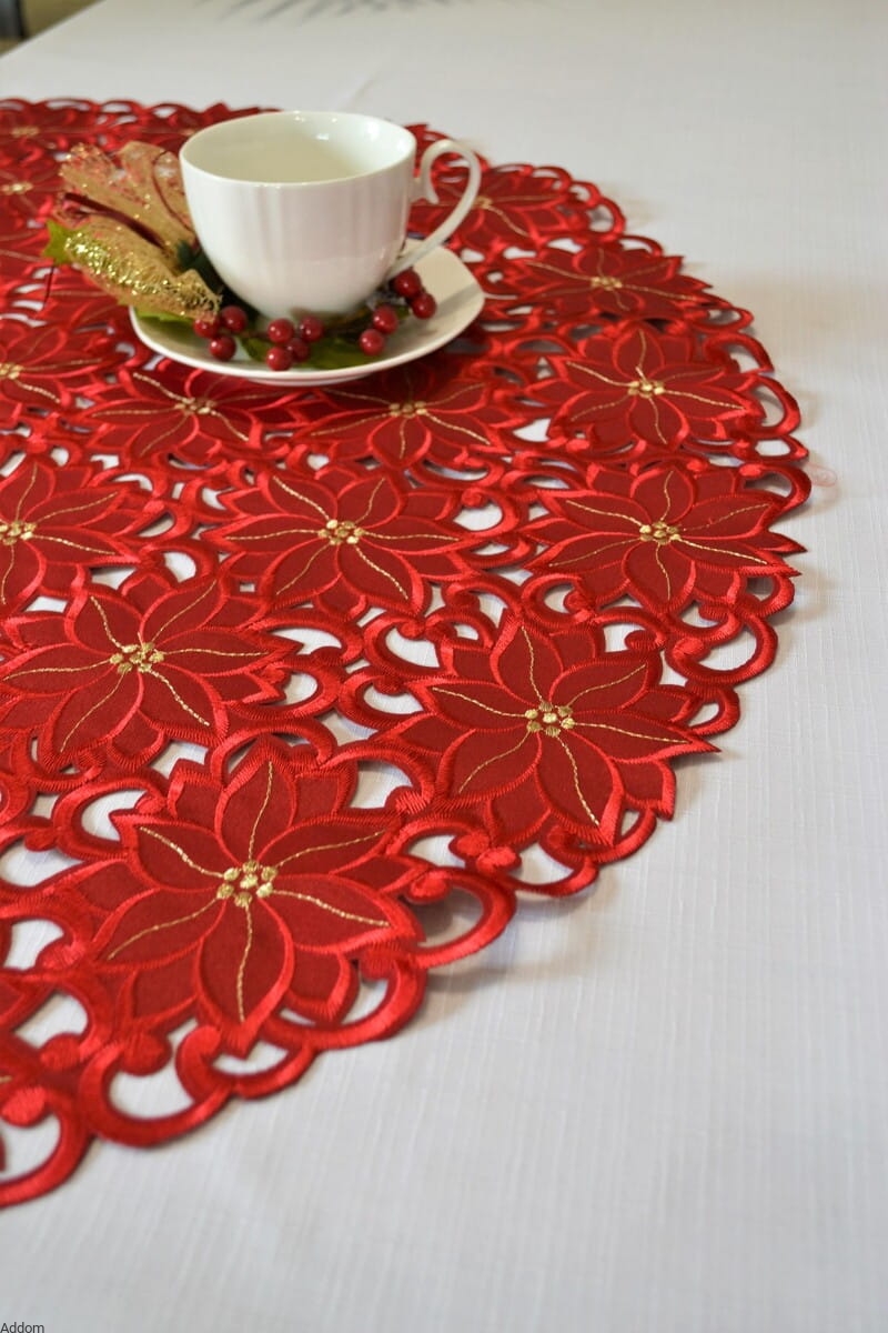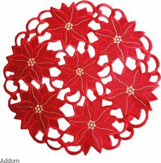 Serwetki z eleganckiej tkaniny, z haftem Richelieu, w których różowe kwiaty są dodatkowo haftowane złotą, błyszczącą nicią, co nadaje im odświętny charakter. Serwetki są okrągłe lub owalne, pakowane pojedynczo, każda serwetka ma swoje opakowanie foliowe. Haft jest bardzo staranny, misterny, serwetki są wyśmienitej jakości.