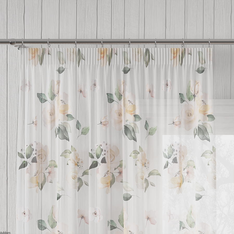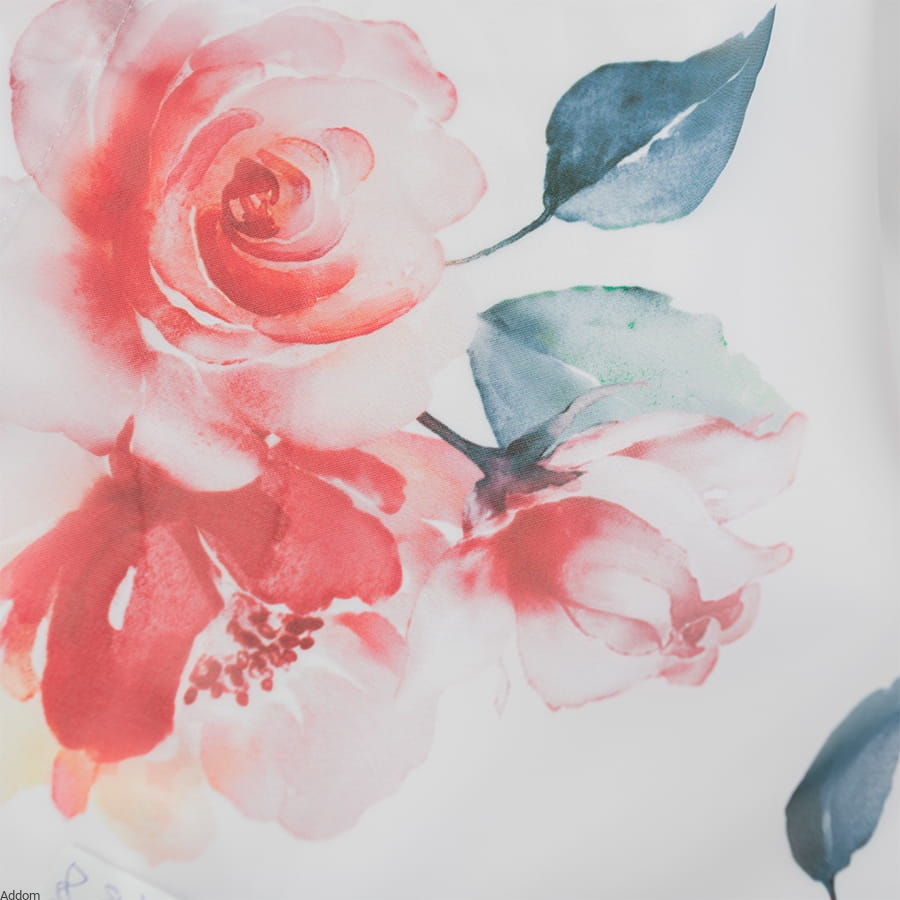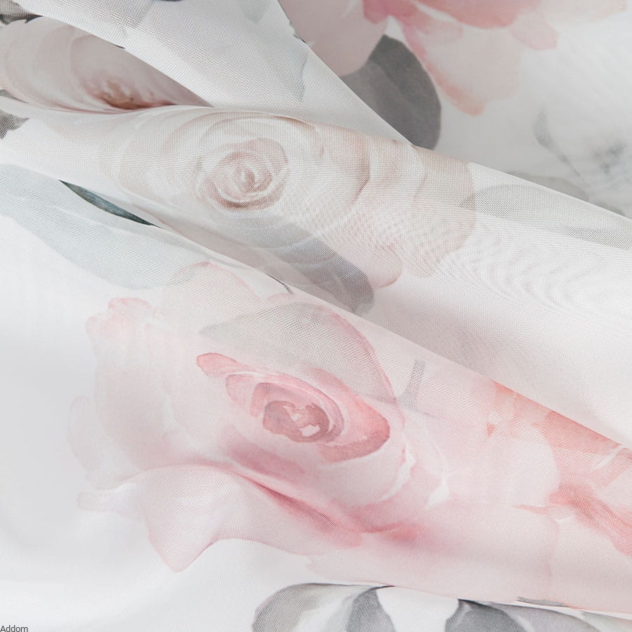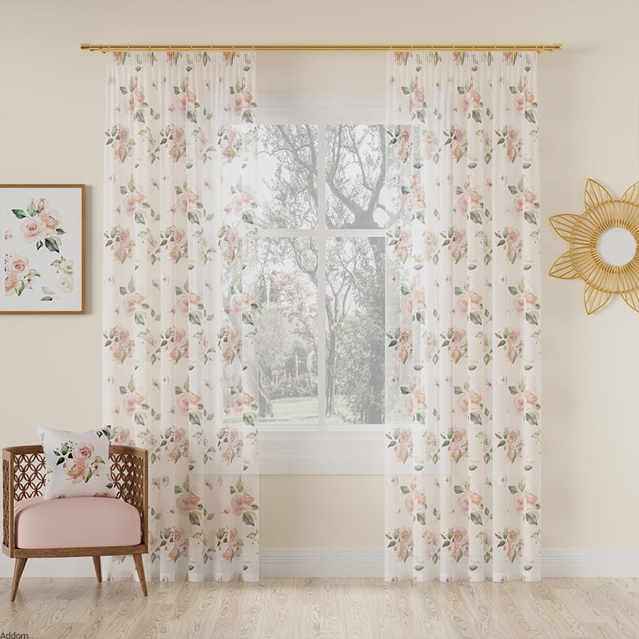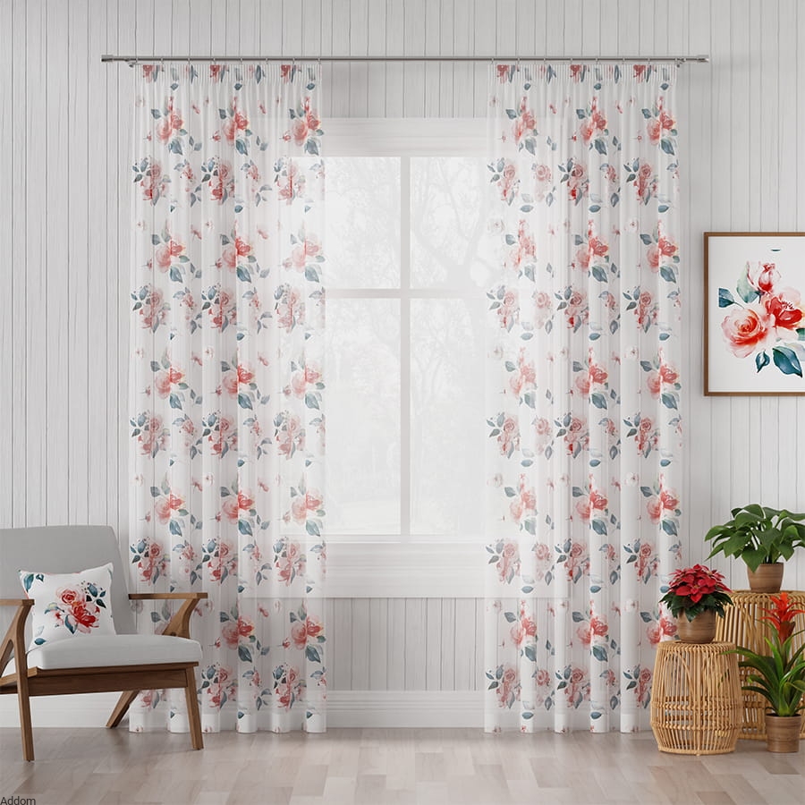 Biały woal w łososiowe róże, który można odwracać, czyli stosować go pionowo lub poziomo, bowiem wzory są uniwersalne i nieważne, którą stroną będą wisieć, zawsze będą umieszczone właściwie.