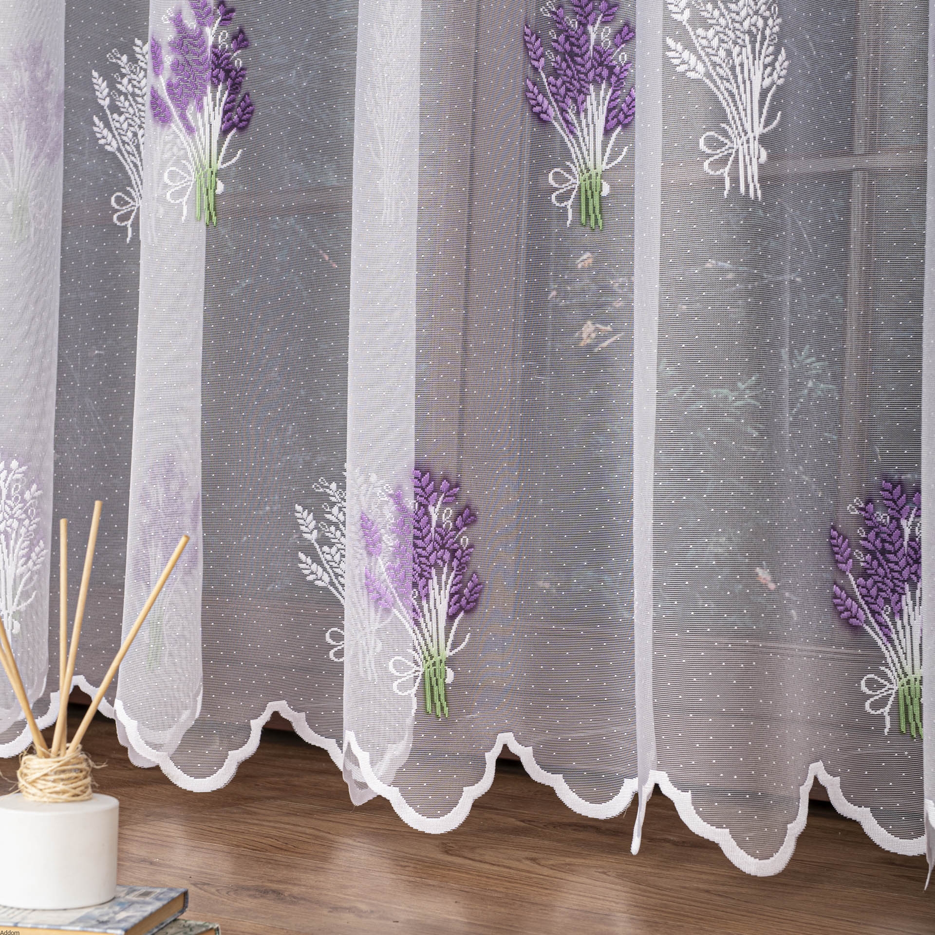 Gęsty żakard polecany do kuchni ze względu na kwiatowe wzory rustykalne, jakimi są bukiety fioletowej lawendy. Firany są cięte z metra, a więc można zamówić dowolną ilość centymetrów i dopasować je do swojego okna precyzyjnie. Żakard ze względu na swoją przewiewność nie zaburza cyrkulacji powietrza.