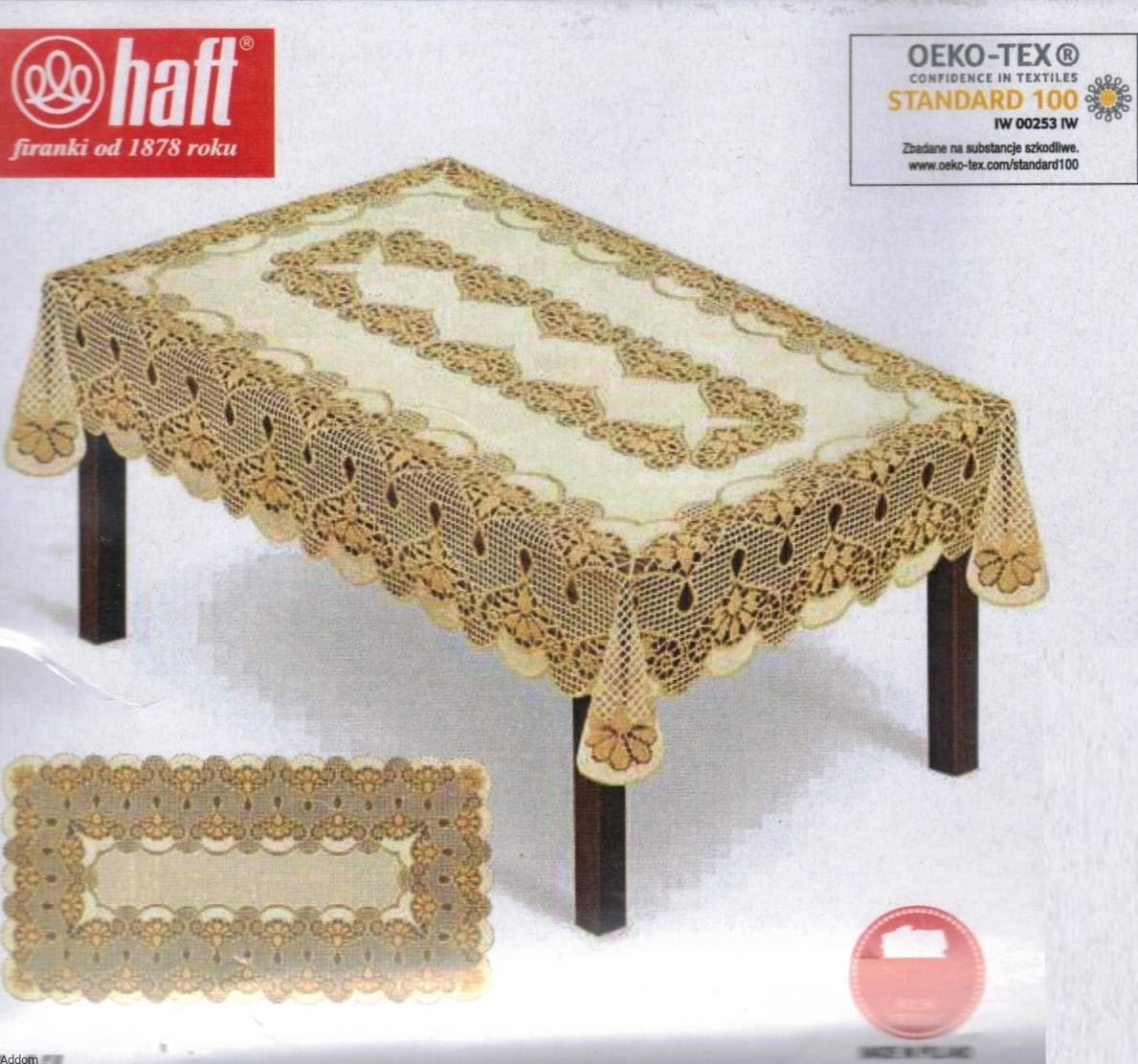 Obrus kaliski, wytworzony z przędzy jasnej kremowej o zimnym odcieniu, z której wykonane jest tło, oraz złotej, ciemniejszej niż tło, którą wykonano wzory kwiatowe i szlaki geometryczne wypełnione kratką. Środek jest jednolity, pełny, boki obrusów są krateczką prześwitującą, która wypełnia przestrzeń między górnym a dolnym brzegiem bocznego, szerokiego szlaku dekoracyjnego.