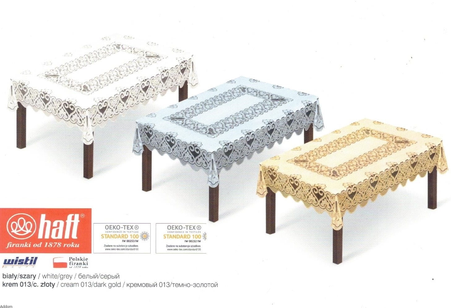 Grube, polskie obrusy żakardowe, wytworzone w Kaliszu, o pełnym, prostokątnym środku oraz grubym wzorze ażurowym w formie uniwersalnych deseni roślinnych. Obrusy należą do grubych, mało przejrzystych, dobrych do ochrony blatu. Dekoracja ażurowa naokoło obrusy jest szerokości 25 cm, przez co obrus staje się bardzo dekoracyjny, mimo, że ażur nie jest tak dziurkowany jak w innych modelach. Wersja kolorystyczne są dwie, biel lub krem - ecru. Ochronne ze względu na środek i dekoracyjne ze względu na boki, obrusy, do których można także kupić firany żakardowe.