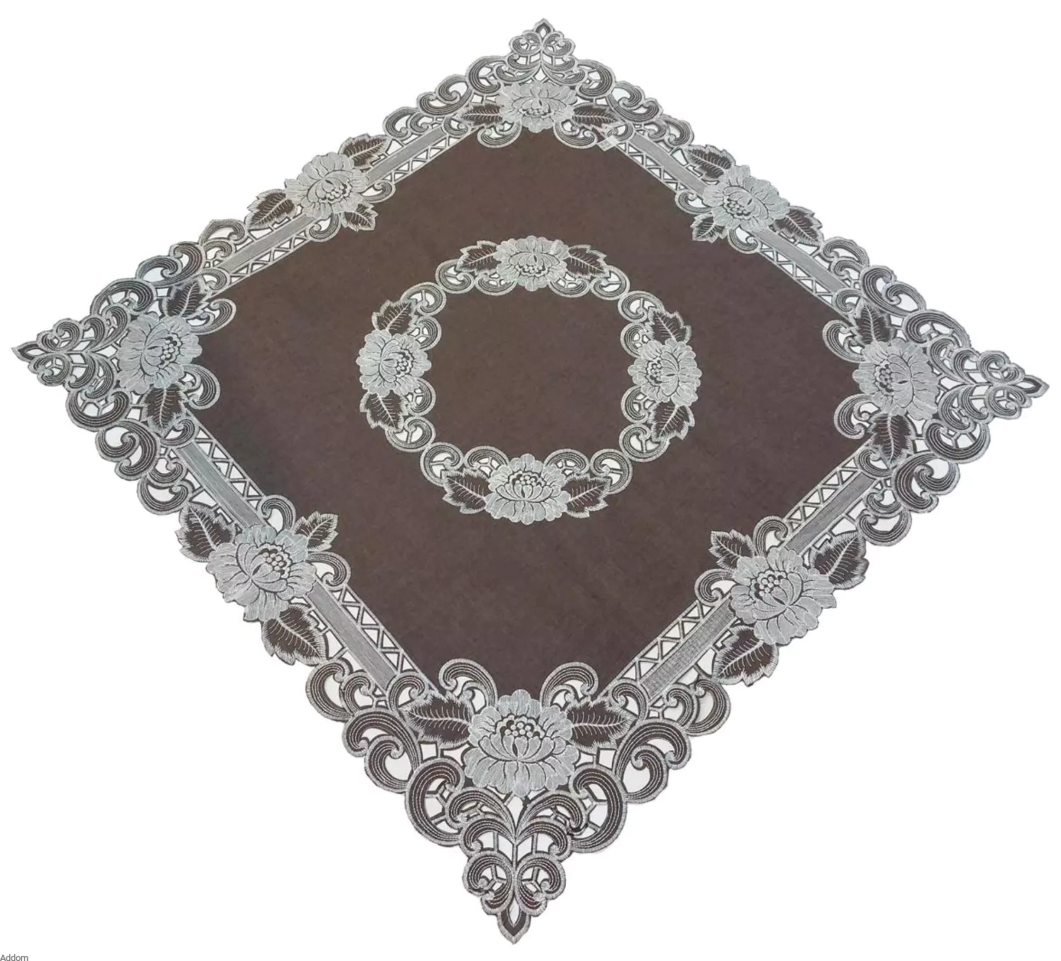 Kwadratowy, obrus z haftem Richelieu w srebrne kwiaty. Co drugi kwiat jest wypełniony bardzo błyszczącą srebrną nicią, mocno błyszczącą jakby była podświetlona. Reszta haftu kwiatowego jest z nabłyszczanej przędzy popielate, stalowej. Bardzo wyrazisty haft czyni ten kwadratowy obrus bardzo dekoracyjnym, a świecące kwiaty przyciągają uwagę.