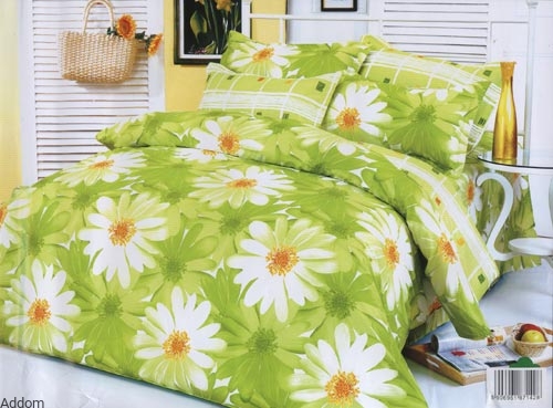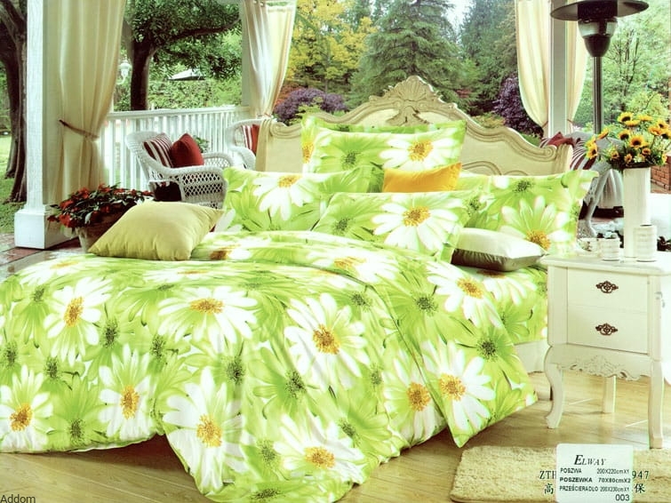Pościel dwustronna na suwaki błyskawiczne, z wygładzonej przędzy bawełnianej, w soczyste, wesołe stokrotki seledynowe na białym tle, z żółtymi środkami kwiatów. Pościel z wierzchu ma duże stokrotki 3 d, a drugiej strony małe, drobne kwiatki na seledynowym tle. W dość eleganckim opakowaniu znajdziecie Państwo 2 poszeweczki 70x80 na poduszki, oraz poszwę 160x200, 180x200 lub 200x220 na kołdrę, natomiast wersja 140x200 zawiera 1 poszewkę na poduszkę.
