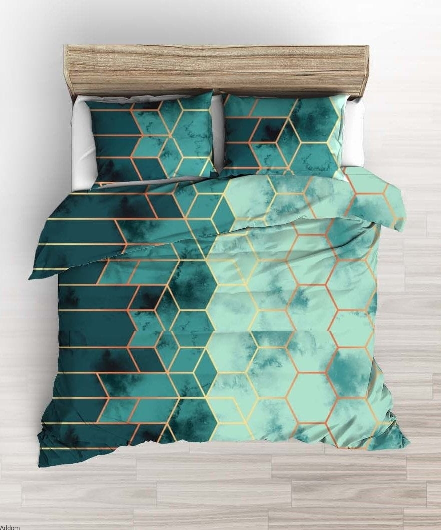 Pościel z poszwą 160x200 lub 200x220, z kontrastującą mozaiką, z obu stron poszew identyczną. Czarne, szare, białe i turkusowo-morskie elementy są bardzo wyraziste. Komplet zapakowany jest gustownie, wraz z 2 poszewkami na poduszki 70x80cm. Zapinana na zamki błyskawiczne, ukryte w bocznych zaszewkach.