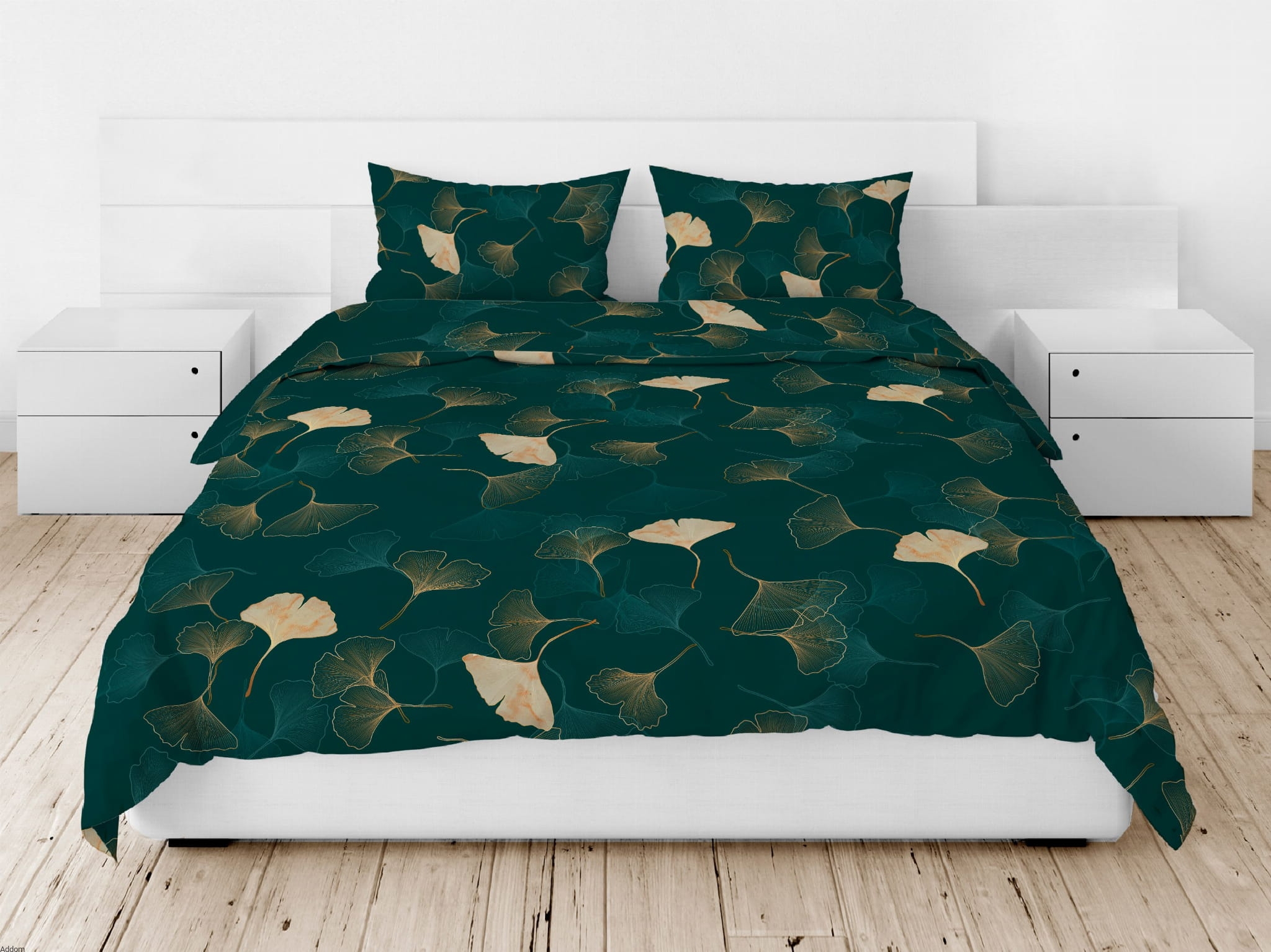 Pełna elegancji szaro biała pościel, gdzie ciemny kolor głębokiej zieleni lub granatu tworzy piękną kompozycję z miodowymi liśćmi jesiennego miłorzębu.
