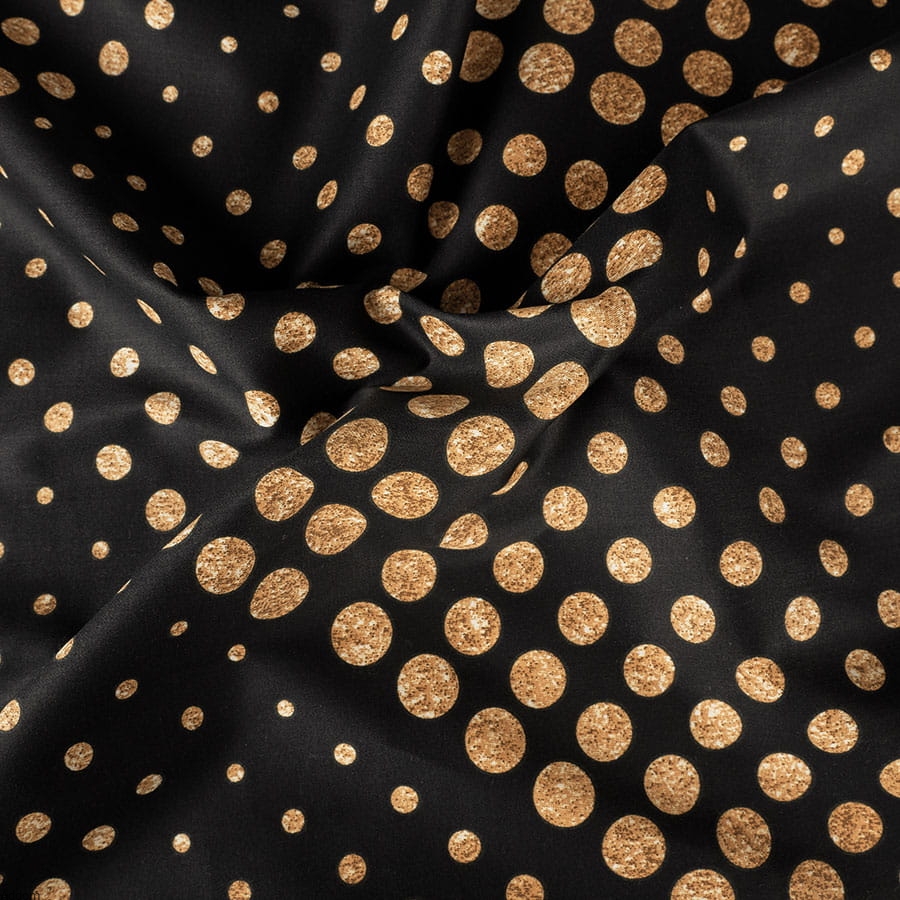 Czarna pościel z delikatnej w dotyku satyny bawełnianej, z zapięciem na zamki. Na czarnym tle umieszczone są złote kropeczki tworzące romby, czyli geometrię w dość nowoczesnym wydaniu. Od spodu pościel jest czarna. Ten sam motyw kropek i rombów z pościeli posiadamy także na zasłonach i poszewkach.