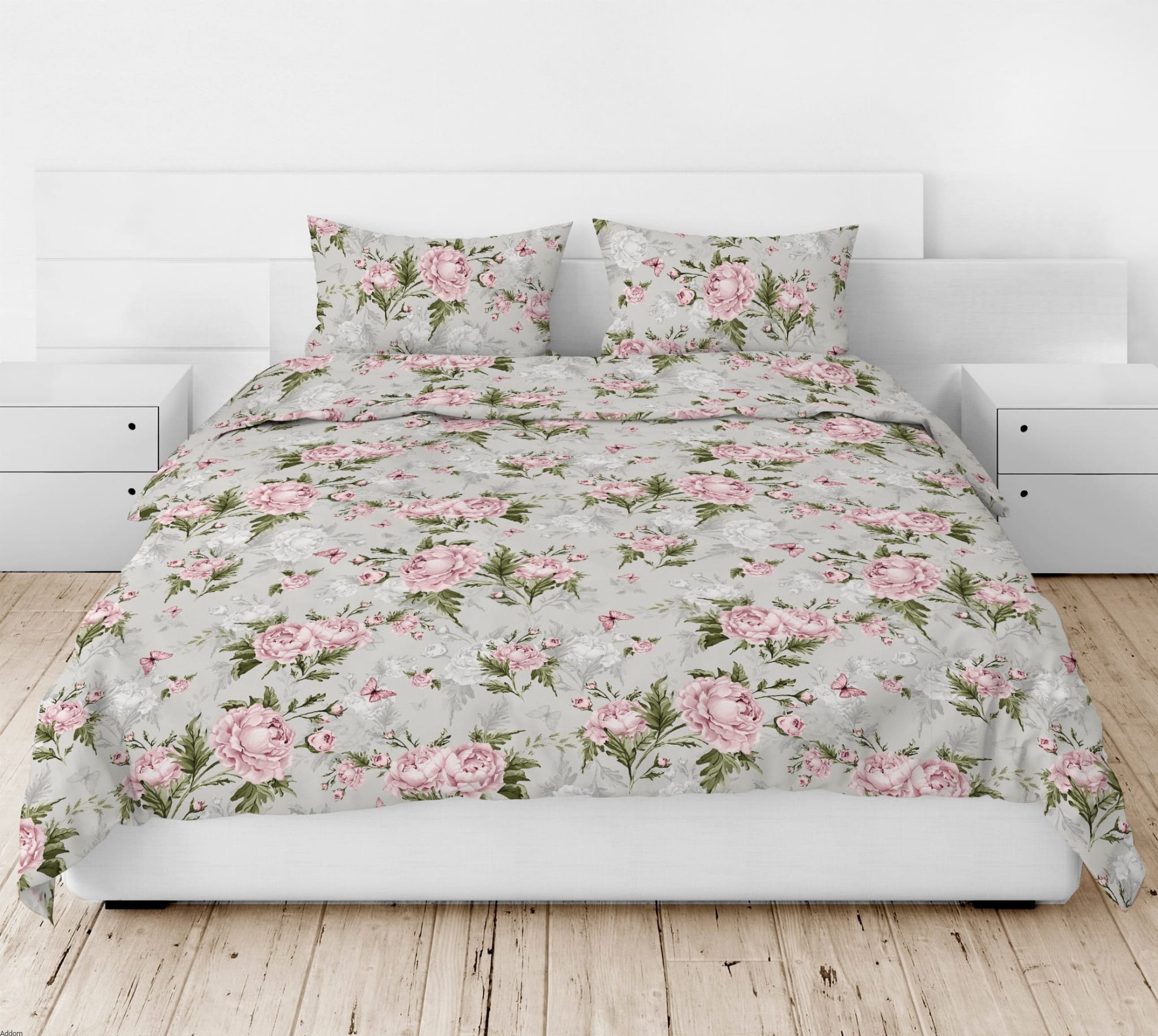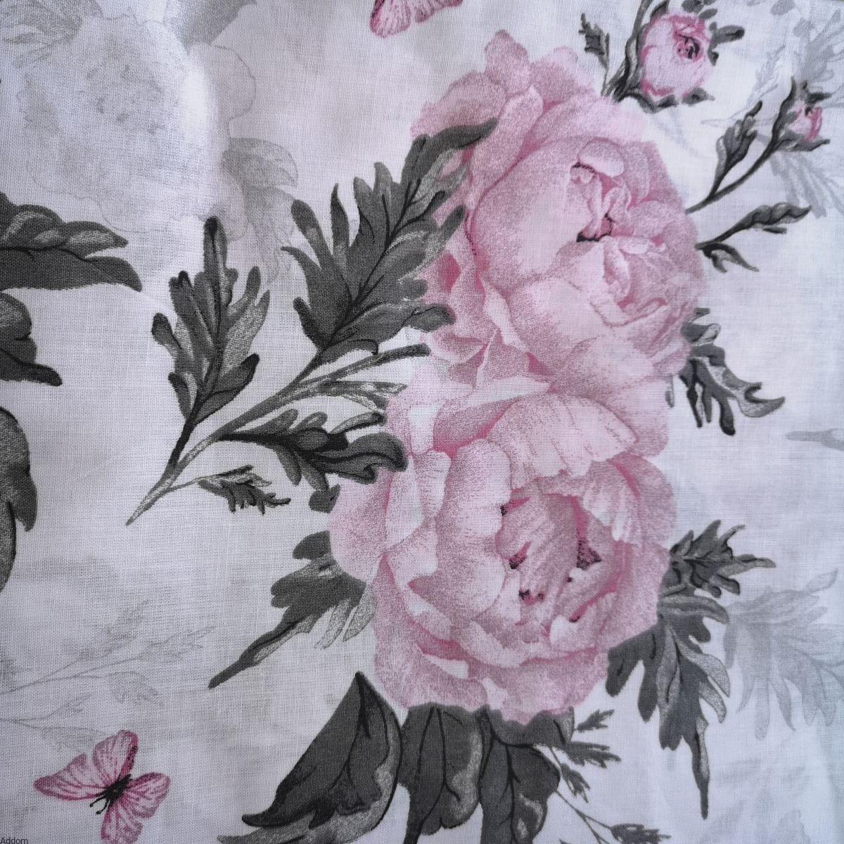 Pościel w kolorze tła śnieżnym białym, w kwiaty różowe, pulchne róże, z dodatkiem średniej wielkości, z dodatkiem miodowych mniejszych kwiatuszków. Kwiaty mają odcień amarantowego różu, świetnie zgrają się z kolorami fuksji, bieli i zieleni, bowiem na pościeli drugim kolorem są zielone listki i łodyżki kwiatów. Od sodu identyczna jak wierzch. Komplet jest 3 częściowy, dokładny skład pościeli w zakładce "Dane techniczne". Rozmiar poszwy zawartej w komplecie 160x200.