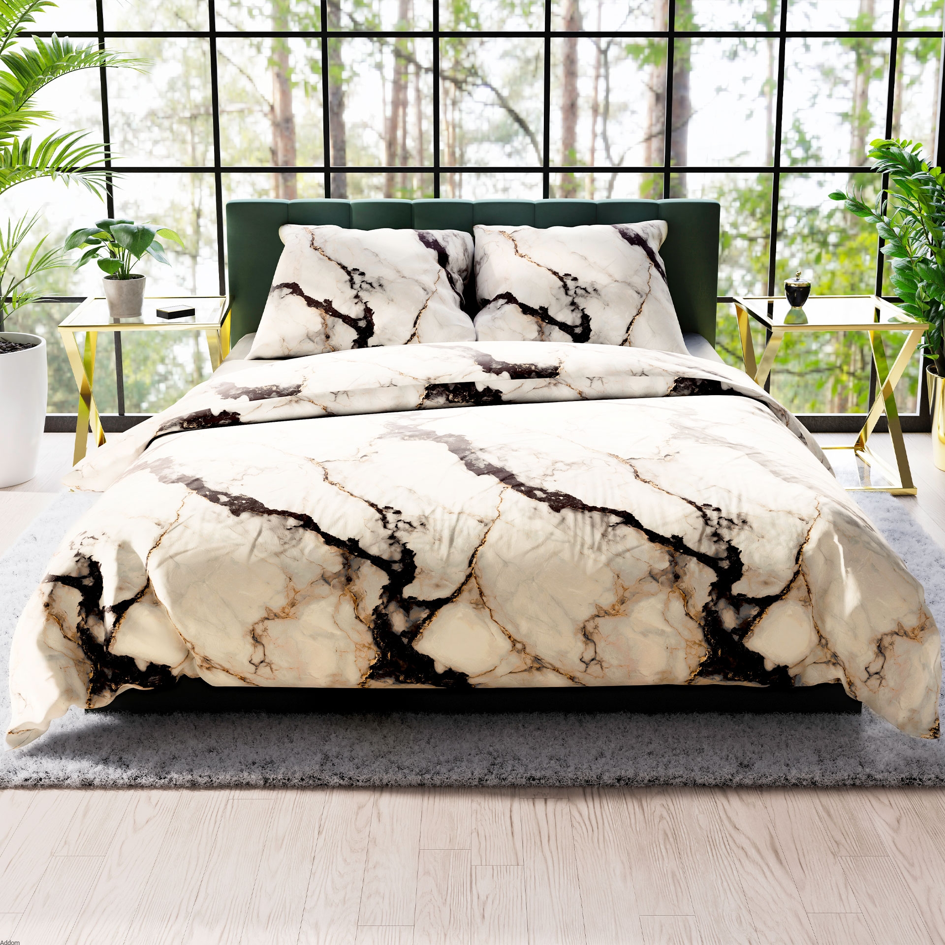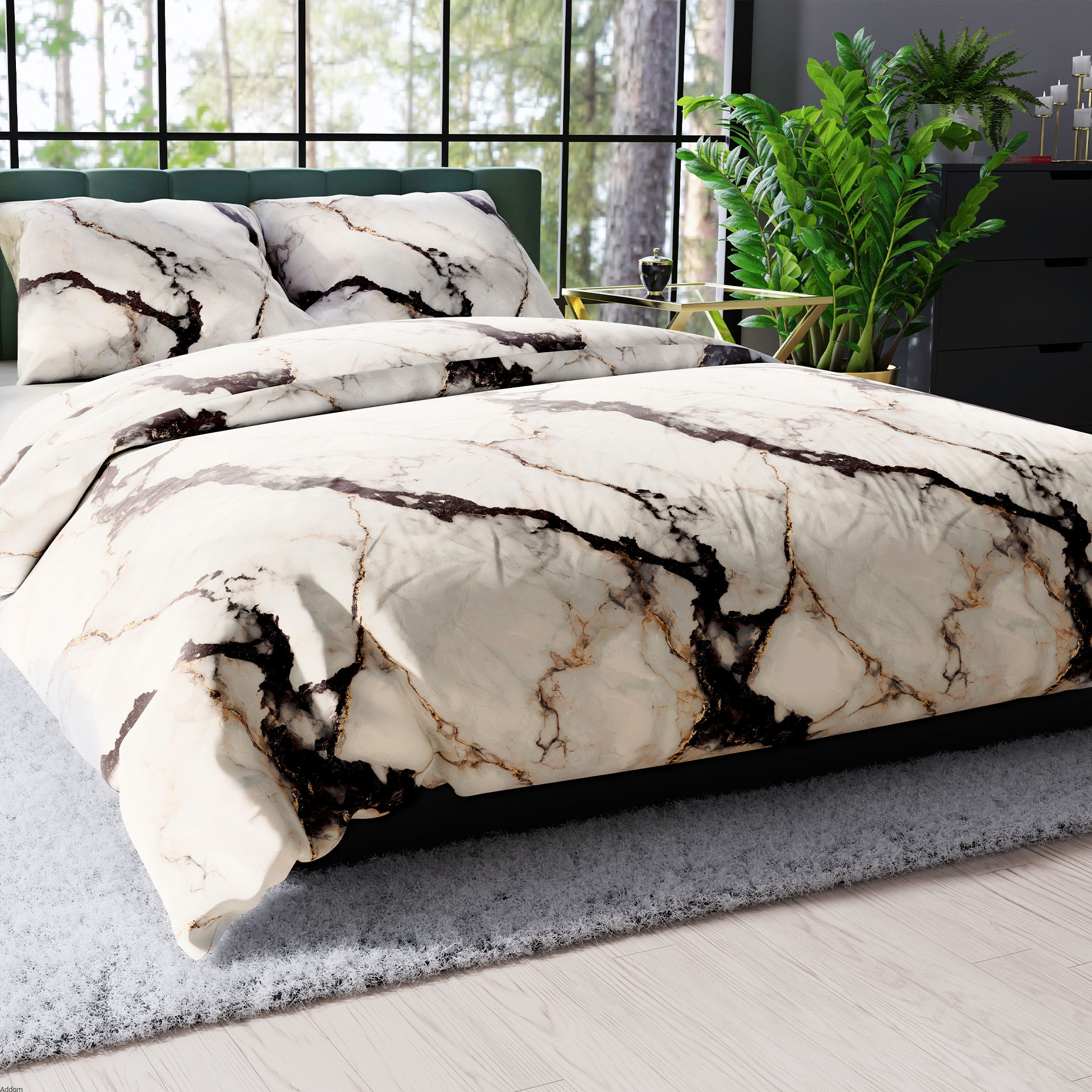 Delikatny marmurowy wzór w odcieniach harmonijnie łączy klasykę z minimalizmem, tworząc atmosferę spokoju i wyrafinowanego smaku. Dzięki zastosowaniu trwałych barwników pościel zachowuje intensywność kolorów i gładkość tkaniny nawet po wielu praniach. Dominuje kolor biały, popielaty, grafitowy z żyłą złota.