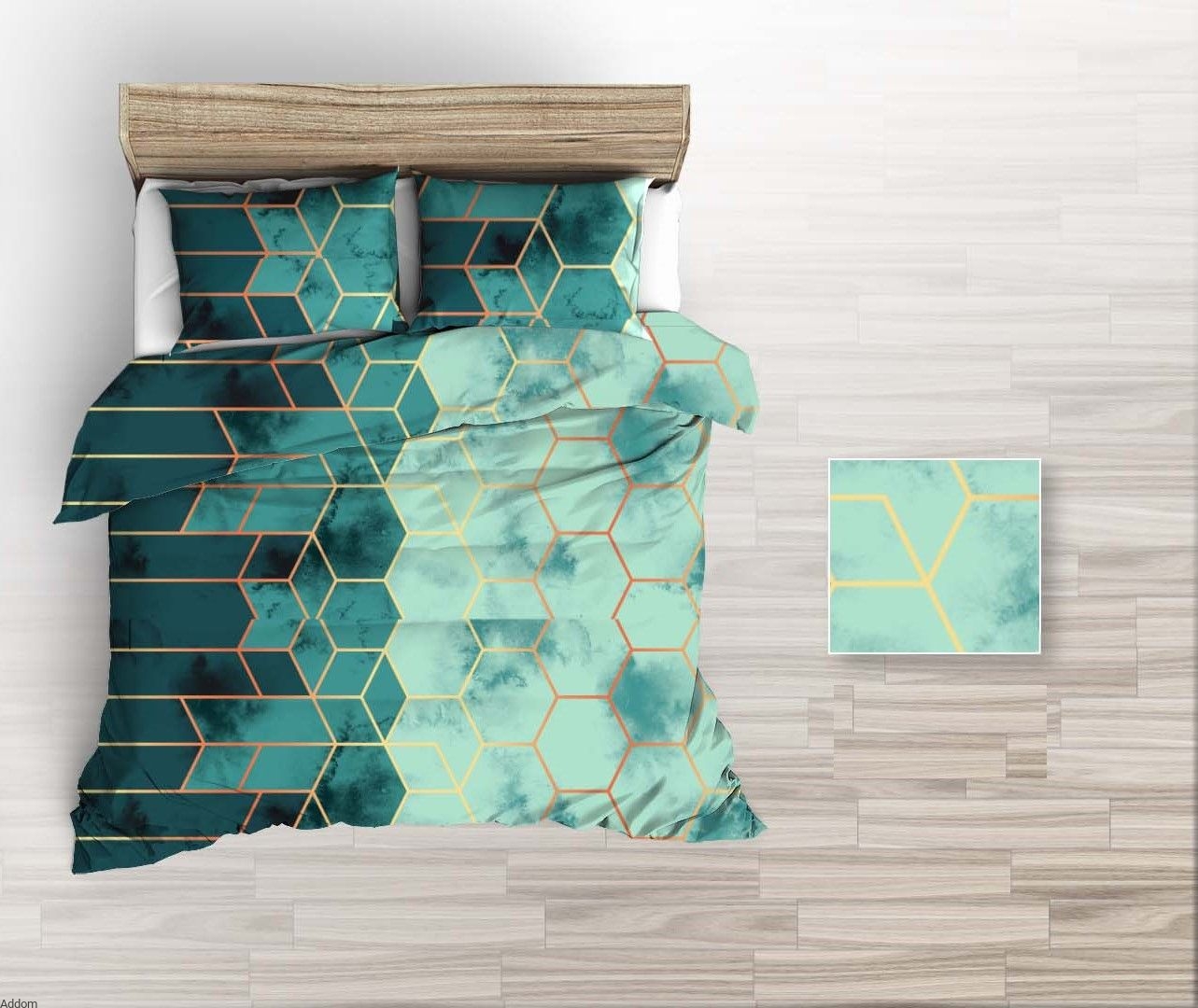 Pościel w kolorze morskiej zieleni,czyli zieleni zabarwionej kroplą niebieskiego, z satyny bawełnianej w duże sześciokąty, w rozmiarze 160x200 lub 200x220 cm. Po lewej stronie pościel jest ciemniejsza, przechodzi w coraz jaśniejszą po prawej. Tło w większości jest marmurkowe, przypominające toń.