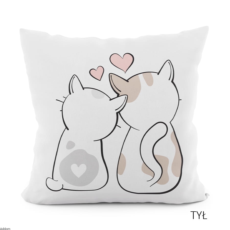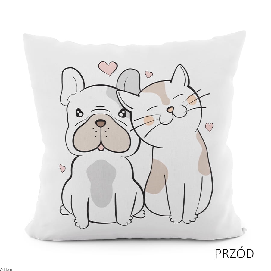 Poszewki polskiej prdukcji w pieski i kotki, z nadrukiem - rysunkiem, na grubej, meszkowatej tkaninie podobnej do zamszu, o wymiarach 40x40 cm. Poszewki z bocznym zamkiem, więc obie strony są użytkowe, druga strona poszewek ukazuje tył kotka i pieska.