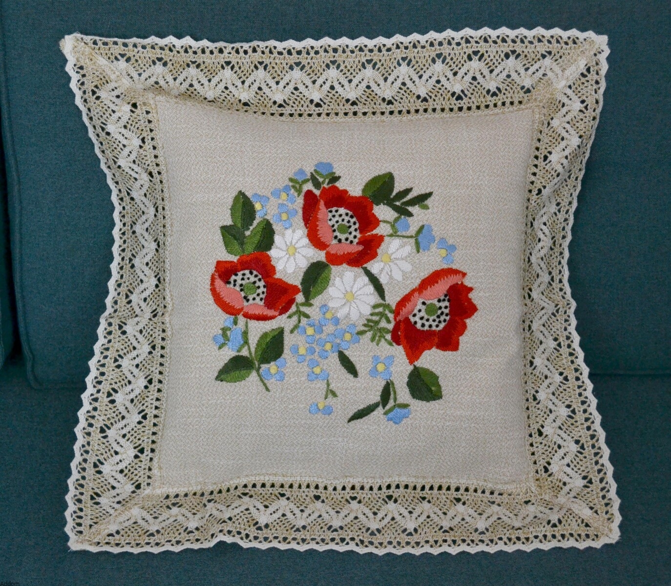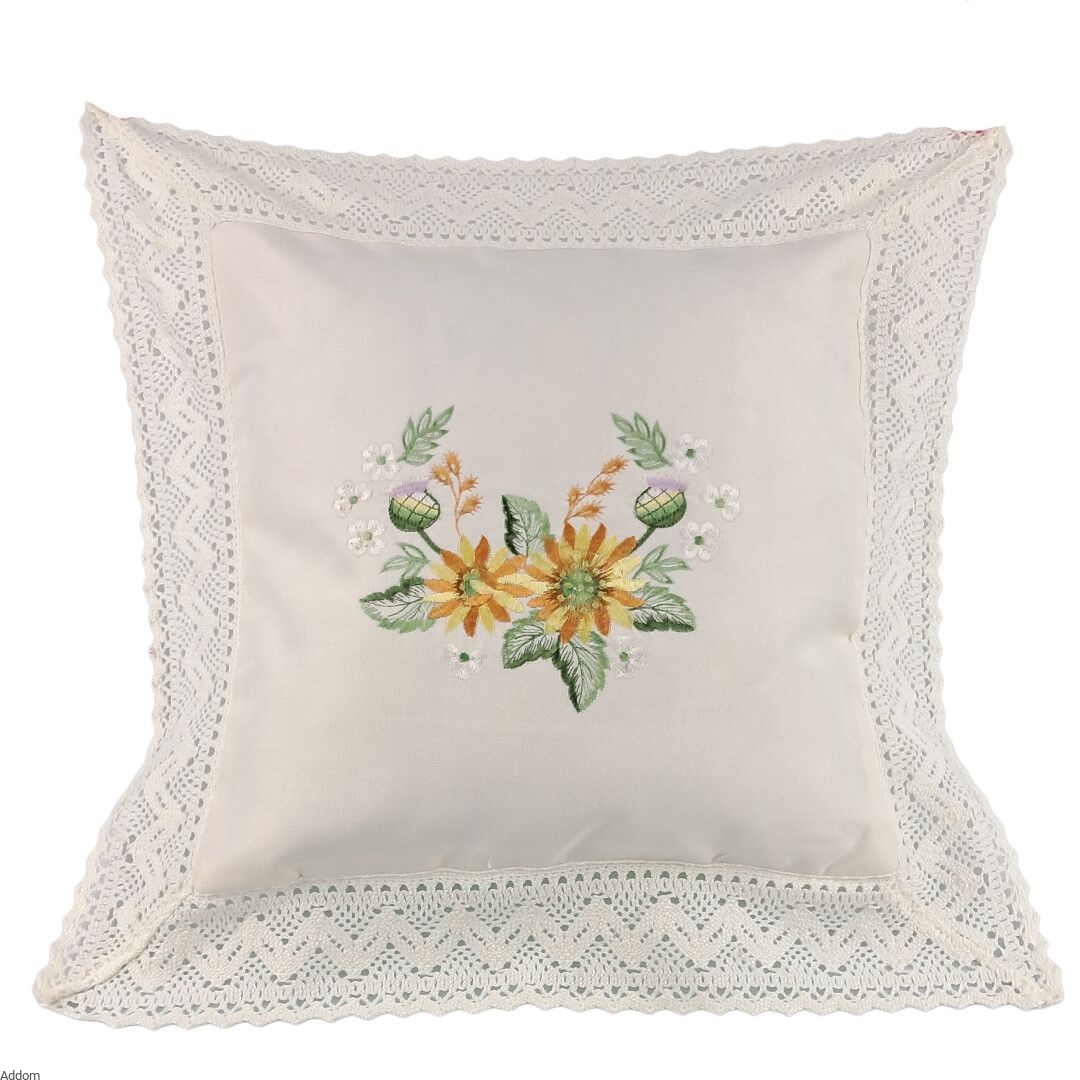 Poszewki dekoracyjne haftowane na środku w kwiaty, zaś naokoło obszyte bawełnianą koronką. Poszewki mieszczą w sobie rozmiar jaśków 40x40 ale wygląd poszewek jest powiększony o doszytą falbankę z koronki.