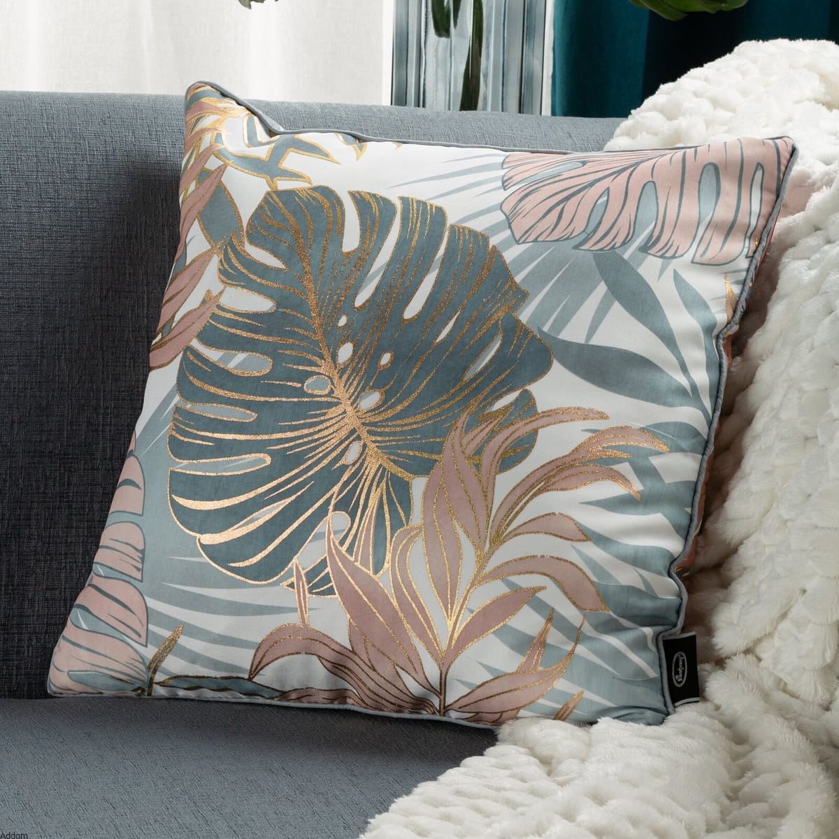 Poszewki o oliwkowo miętowym lub białym, tle, w egzotyczne liście dzikiej, amazońskiej roślinności, w stylu Jungle. Poszewki są uszyte z grubego materiału, lecz miękkiego i milutkiego, a zamek jest wszyty z boku poszewki i umożliwia to użytkowanie poszewek na dwie strony, ale tylko oliwkowe są dwustronne, zielone w liście monstery są z drugiej strony białe. Liście egzotyczne w kolorze zieleni oliwkowej, świetnie zgrają się z innymi stylizacjami w stylu Miejska dżungla. Rozmiar 40x40 cm.
