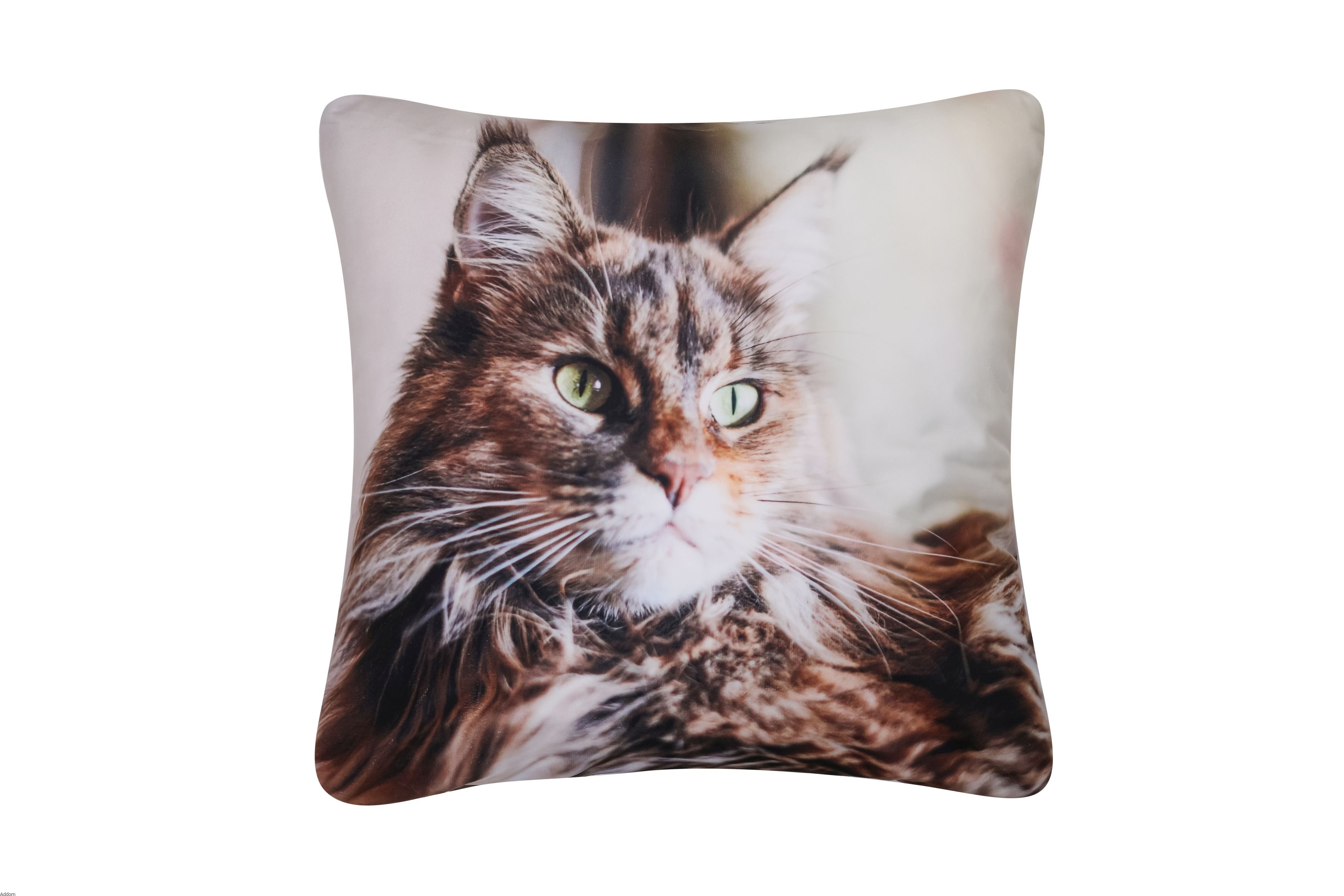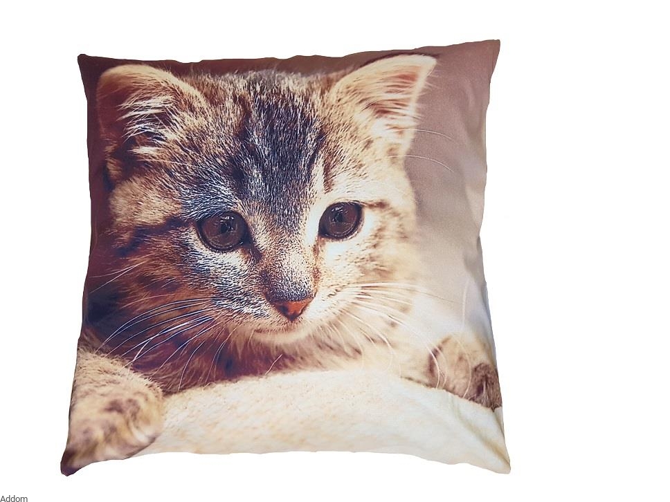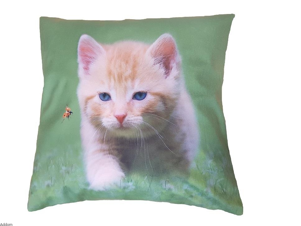 Poszewki w kotki, gobelinowe, z tkaniny żakardowej, o wymiarach 45x45 cm. Poszewki zawierają wizerunek jednego beżowego albo czarnego kotka, lub dwóch rudych kotków z przodu, tył zaś jest bez grafiki. Nić, z której wykonana jest poszewka gobelinowa jest bawełniana w 100%.