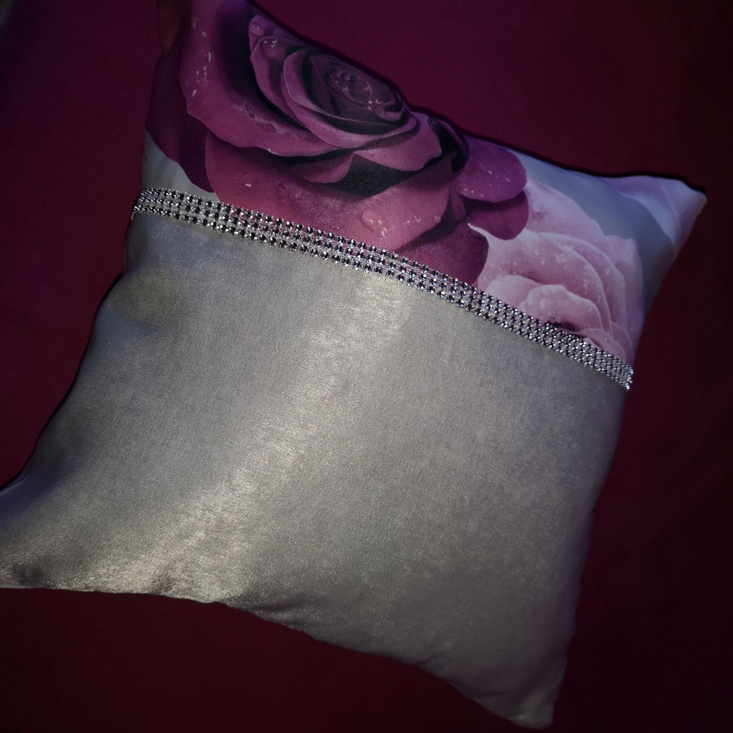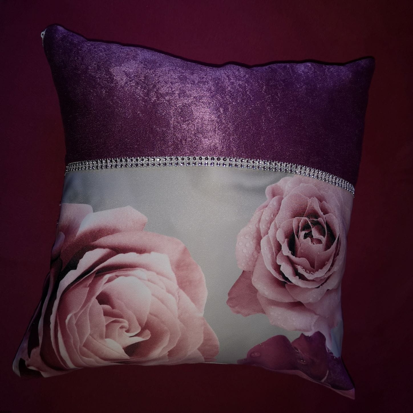 Poszewki dekoracyjne z grubej, meszkowatej tkaniny aksamitnej o niskim włosku, w grafiką róż na szarym tła. Na poszewce znajduje się fotografia 3d, i a kropelki wody na płatkach wyglądają bardzo naturalistycznie. Ponadto każda z poszewek z obu stron jest dekoracyjna, i zawiera inny element wzoru, z obu stron znajduje się także diamencikowy paseczek. Świetnie będą się komponować z jednokolorowymi poszewkami. Poszewki są o wymiarach 40x40 i występują w wariancie z kolorem popielatym oraz fuksji. Tkanina z nadrukiem róż jest zszywana z jednokolorową tkaniną z meszkiem, a miejsce łączenia ukryte jest pod cyrkoniowym paseczkiem dekoracyjnym.