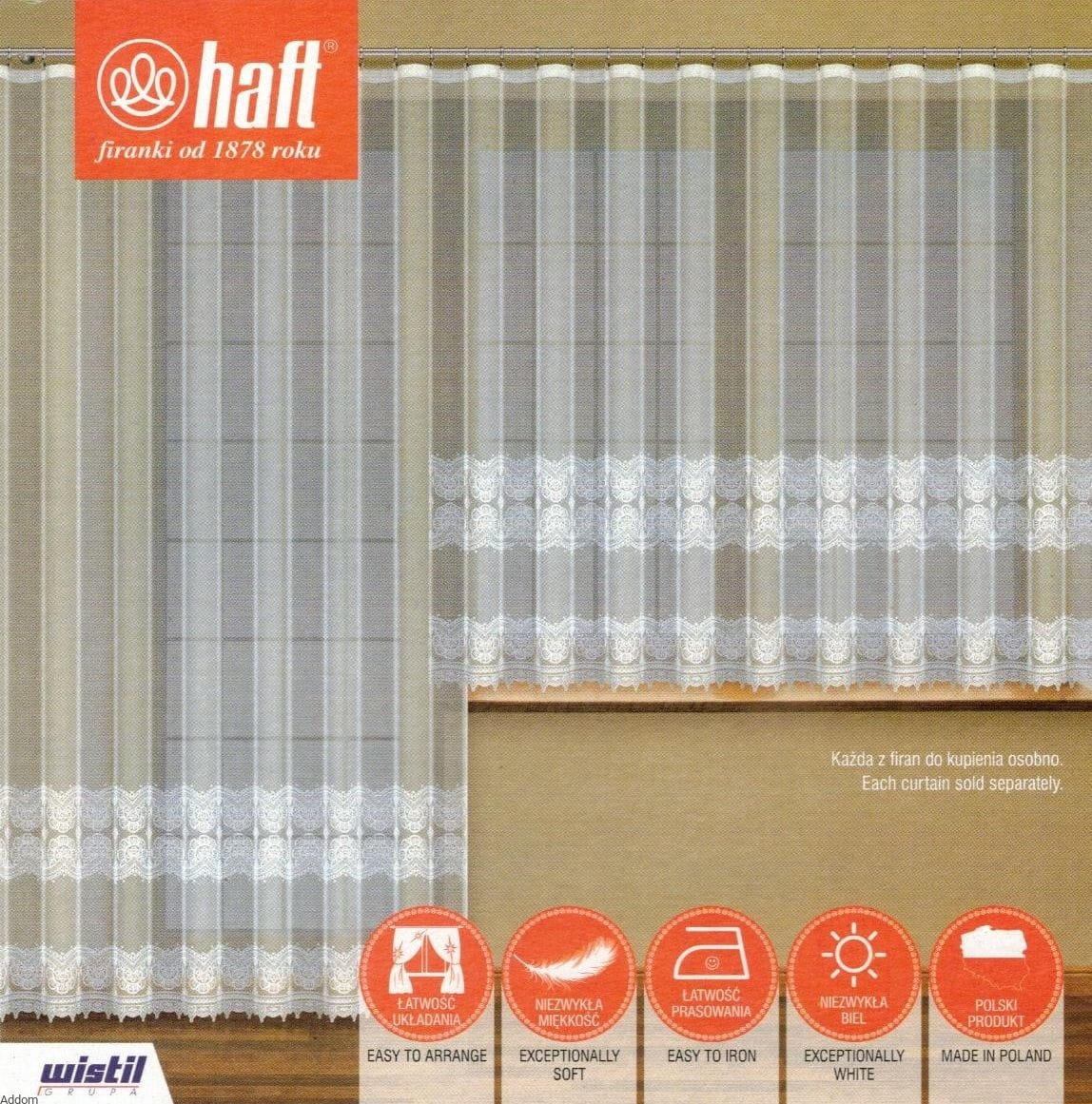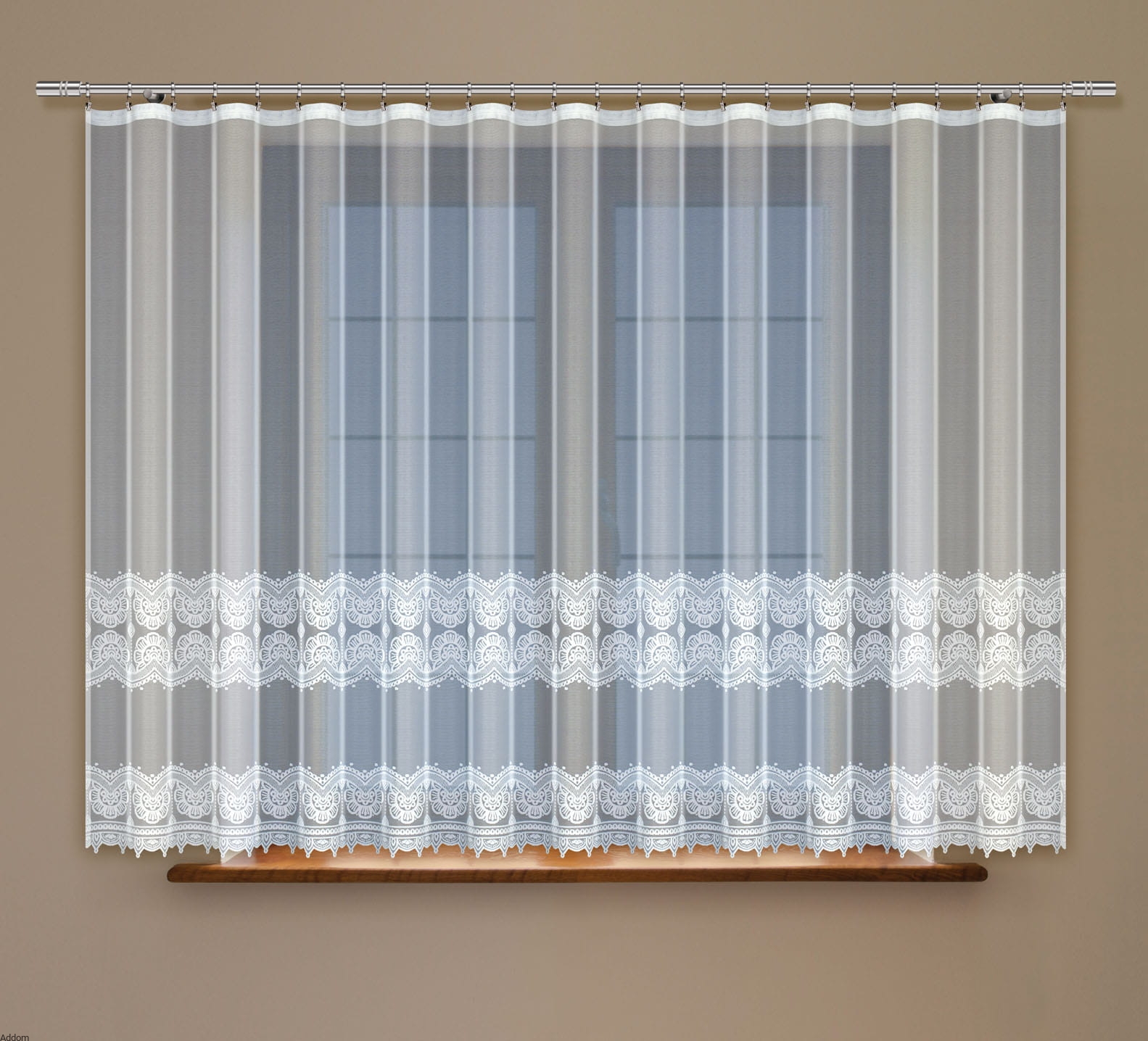 Nasz propozycja firan o prostym dole, na firany balkonowe, w wielu wariantach rozmiarów, w wariantach krótkich lub wysokich firan. Tło bielutkie i gęste, szlak dekoracyjny zdobiący dół firan gruby i wypukły, a góra z taśmą marszczącą.