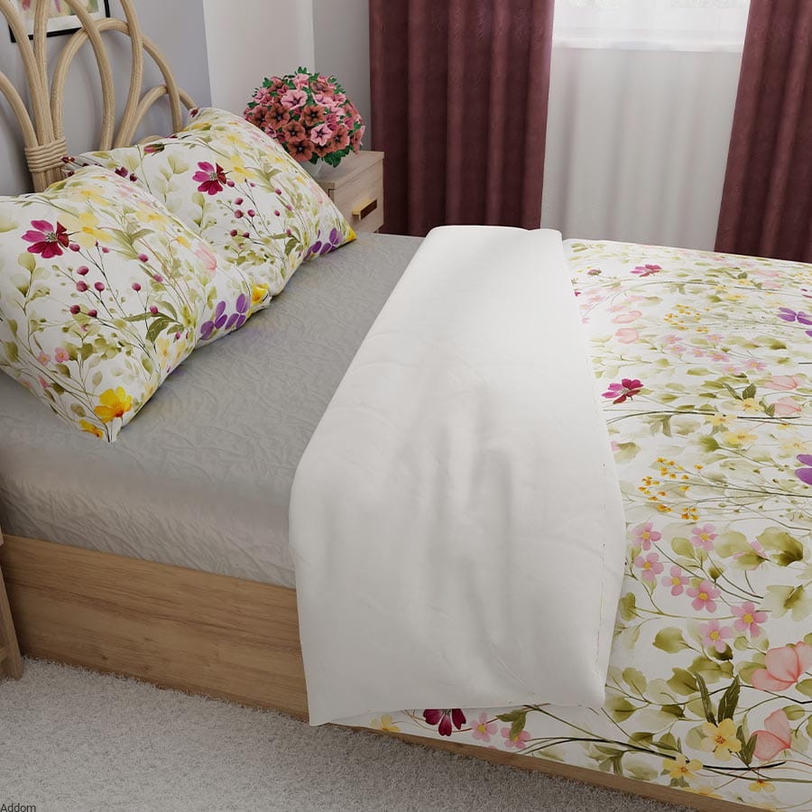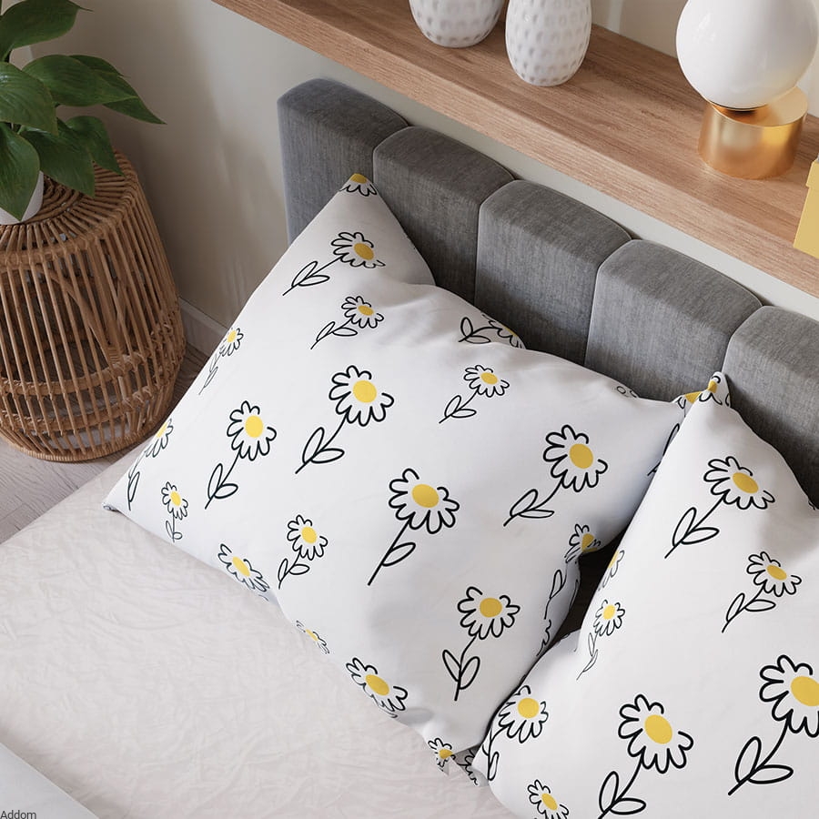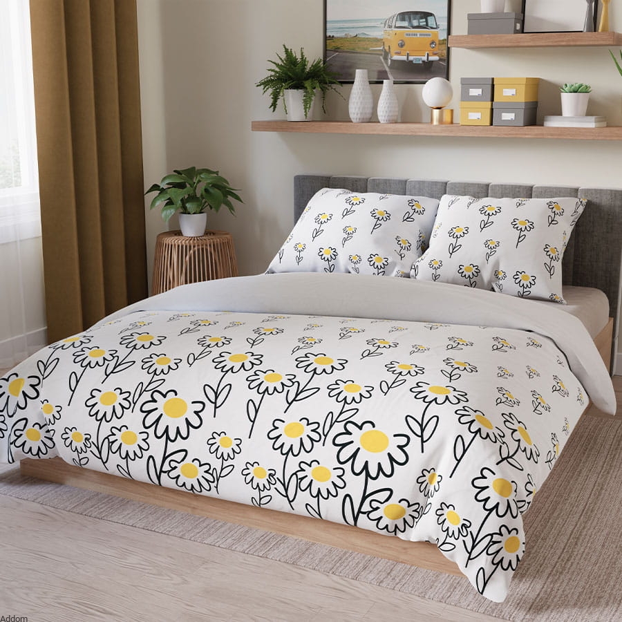 Motyw polnych kwiatuszków w kolorze żółtym, czerwonym, niebieskim, na białym tle dodaje pościeli świeżości i energii. Żółte i czarne kwiatuszki, w minimalistycznym i stylowym wydaniu, tworzą ciekawy kontrast na białym tle, nadając całości nowoczesnego, a zarazem subtelnego charakteru. Taki wzór doskonale sprawdzi się w sypialniach o współczesnym wystroju, wprowadzając do wnętrza przyjemny akcent kolorystyczny i odrobinę elegancji.