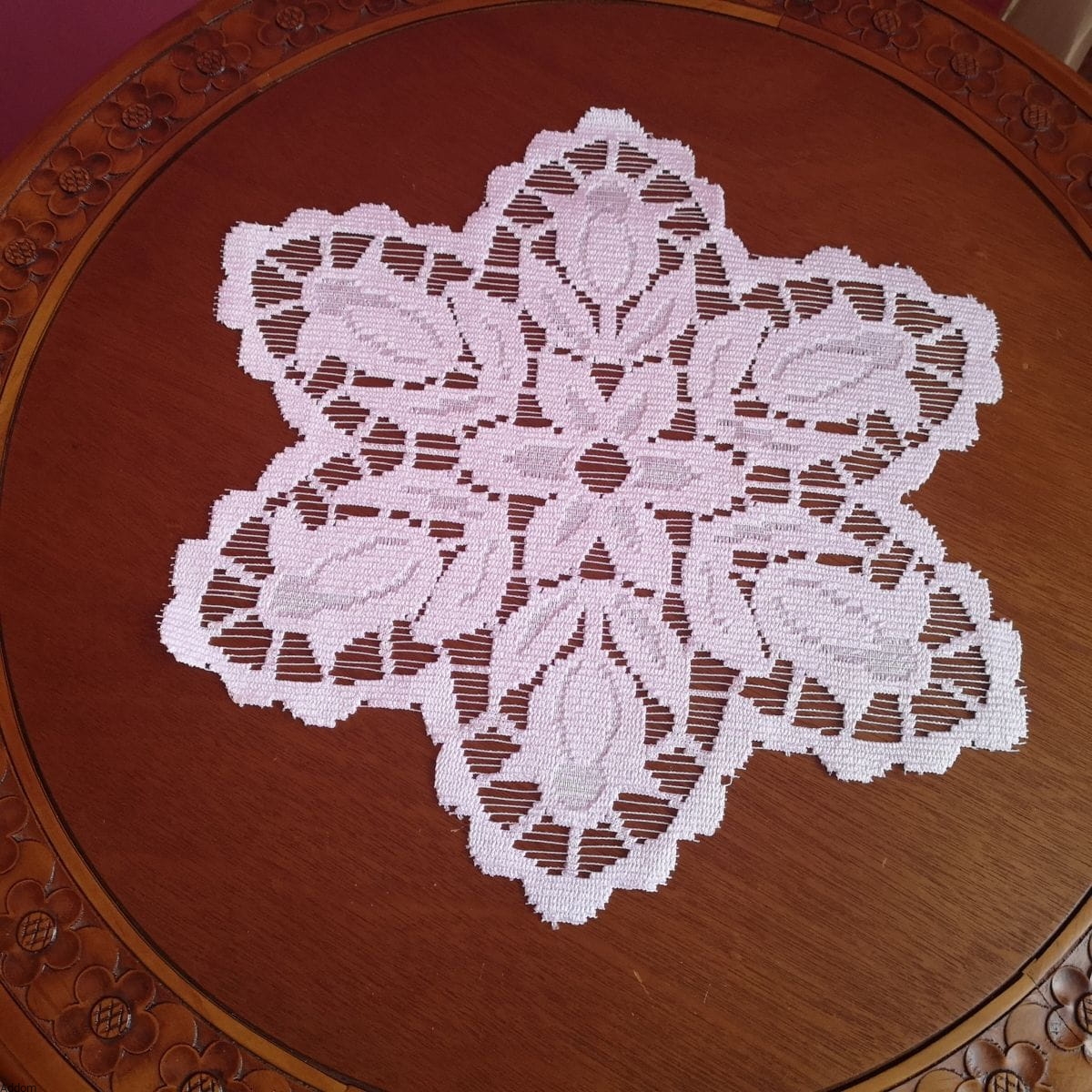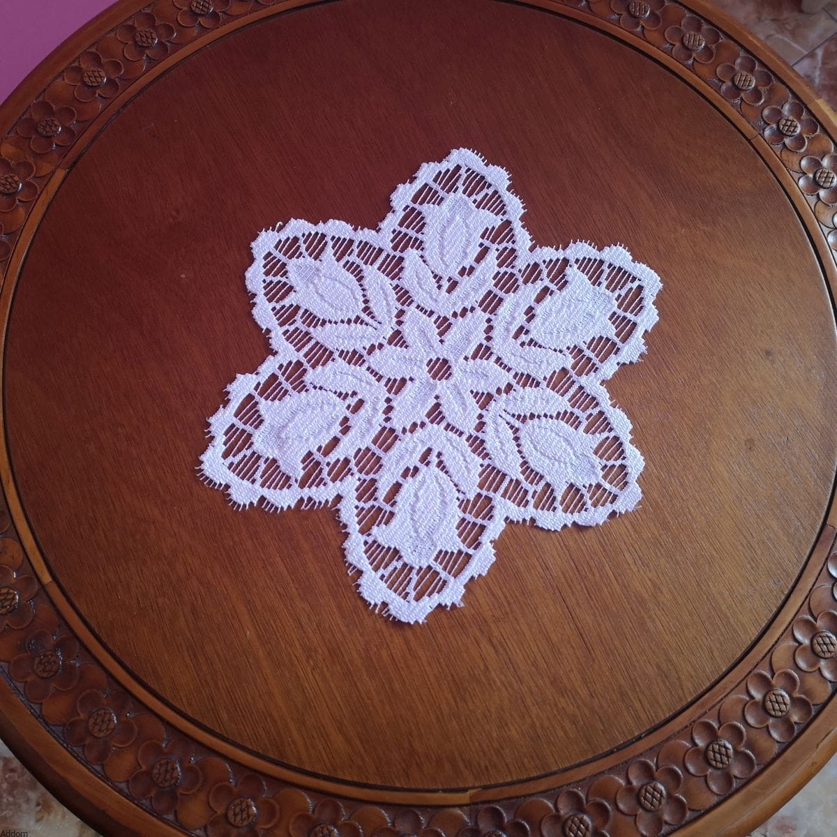 Serwetki w kwiatki, tulipany, skierowane główkami na zewnątrz, środek zaś stanowi kwiatek w typie stokrotki. Tulipanki otoczone są ażurem, przez który kontrastować będzie kolor stołu, podkreślając kwiatuszki. Oferta naszego sklepu internetowego obejmuje 2 rozmiary tychże serwetek. Mniejsze mają średnicę 25 cm a większe 35 cm. Na zdjęciu głównym zaprezentowaliśmy tę mniejszą.