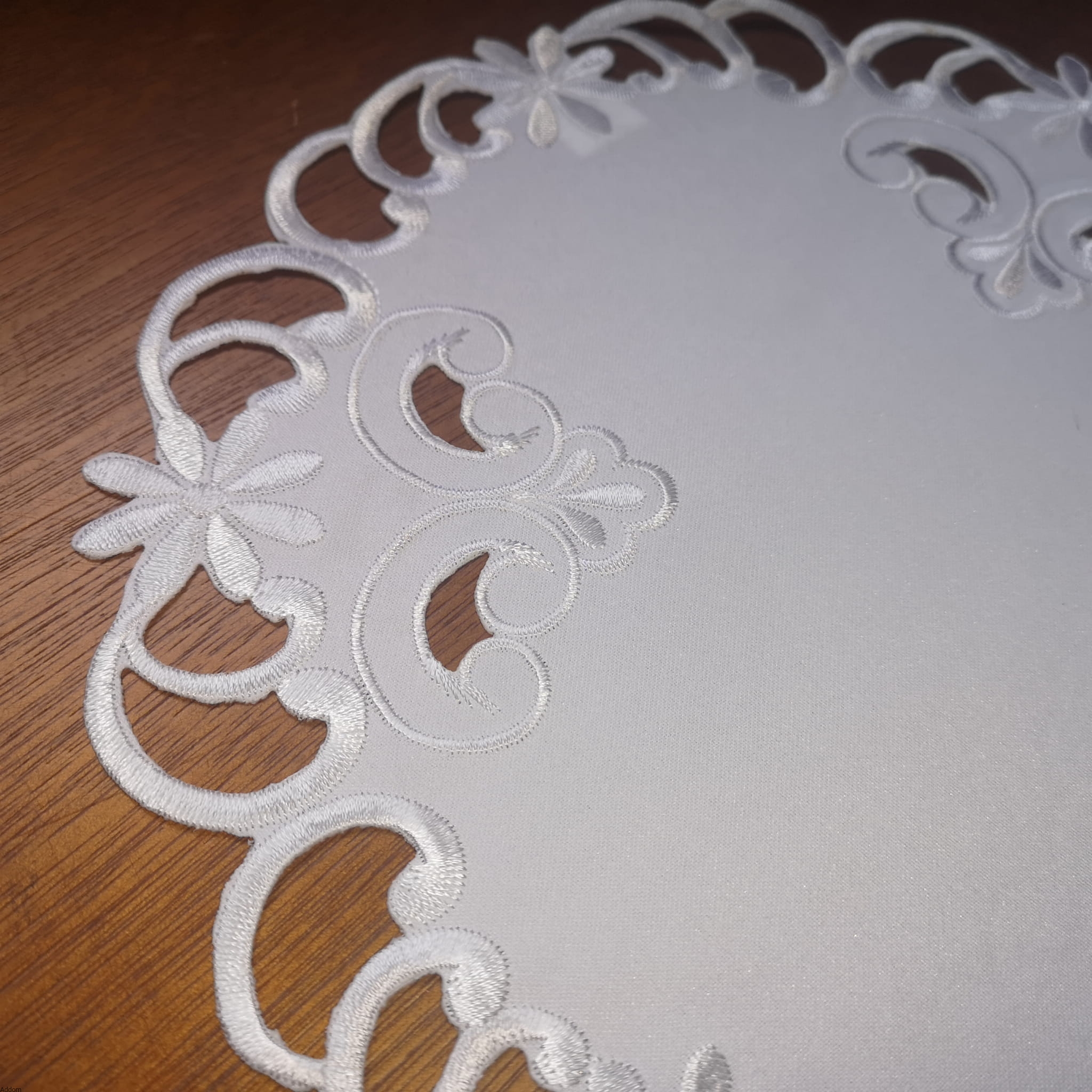 Okrągłe serwetki tkaninowe, haftowane, z falowanym, ażurowym wzorem kwiatowym na brzegu serwetek. Środek pełny w kolorze białym matowym, kwiaty po obrysie z przędzy w kolorze błyszczącej bieli. Serwety mają średnicę 50 cm, zaprezentowane są na zdjęciach na blacie o średnicy 60 cm. Ten sam wzór znajdziecie na umieszczonych w zakładce produktów powiązanych obrusach i bieżnikach.