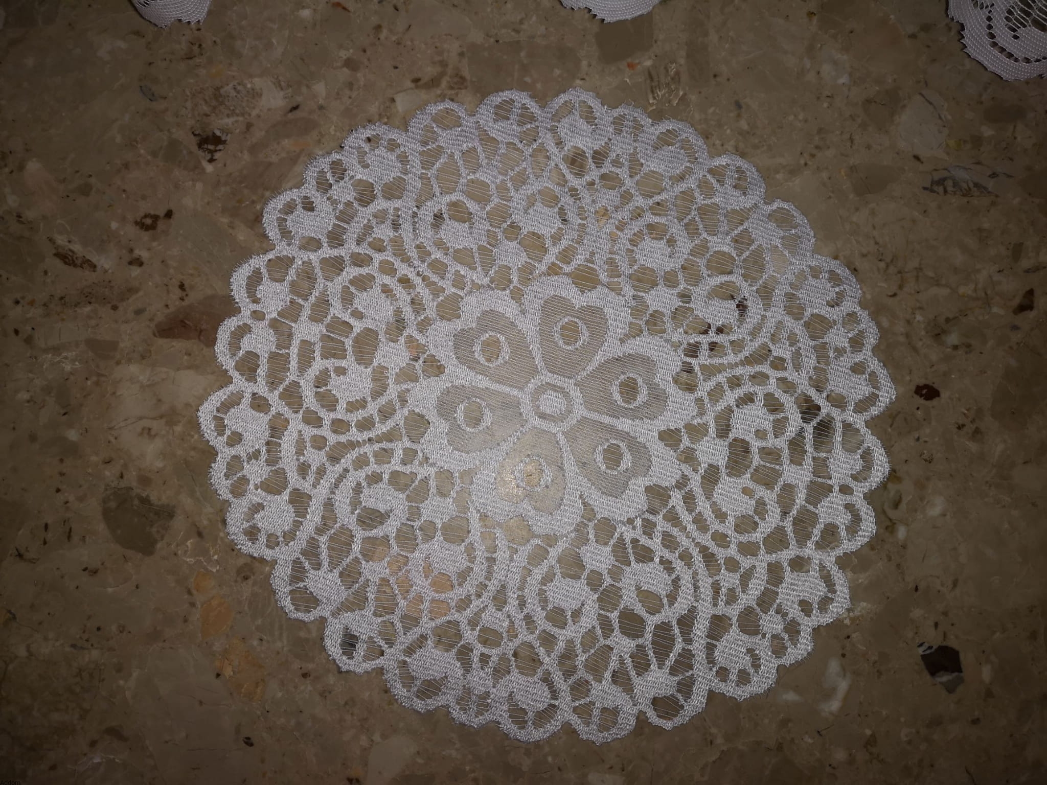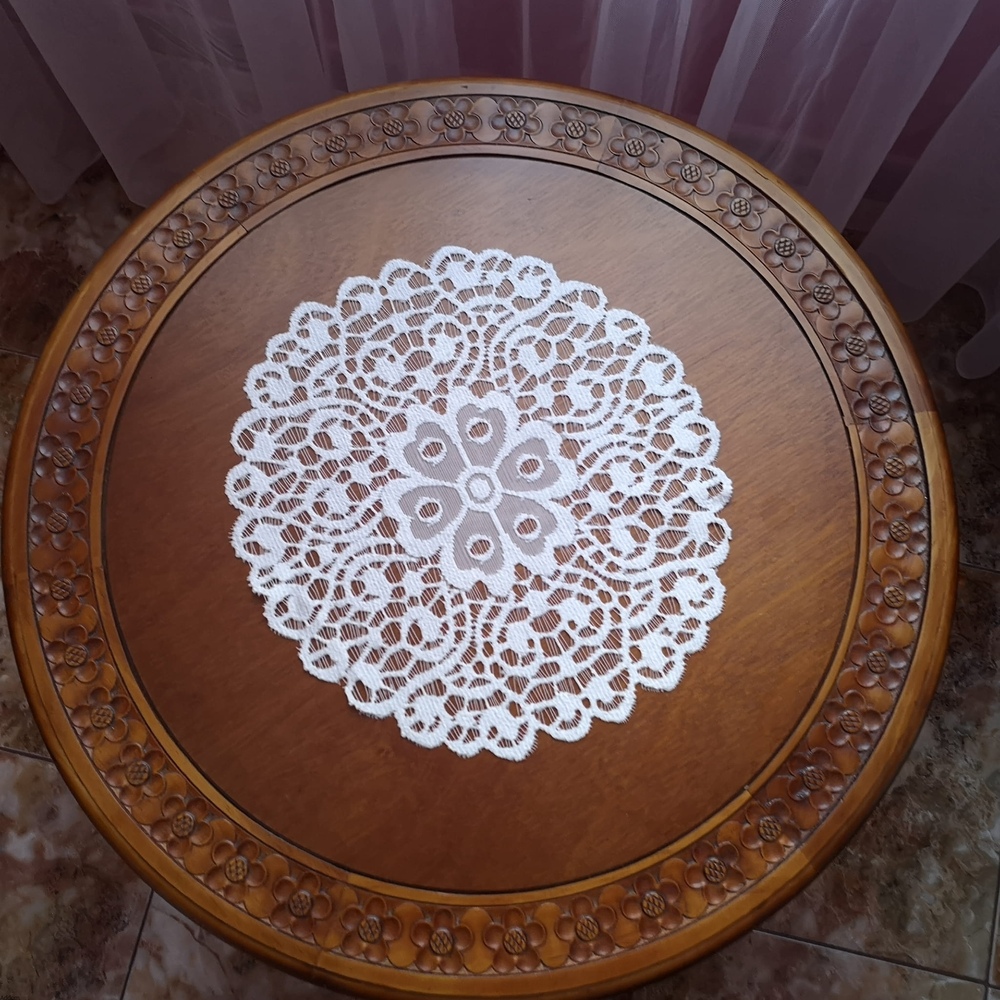 Białe i kremowe serwetki z kwiatem na środku, mające średnicę 30 cm, oraz ścieg wypukły, stylizujący je. W serwetkach zastosowano grę nici, czasem tworzy ona płaski wzór, czasem wypukły, a czasem jej brakuje, i powstaje ażur. Do serwetek okrągłych można dobrać serwety owalne, mające 2 kwiatuszki na środku.