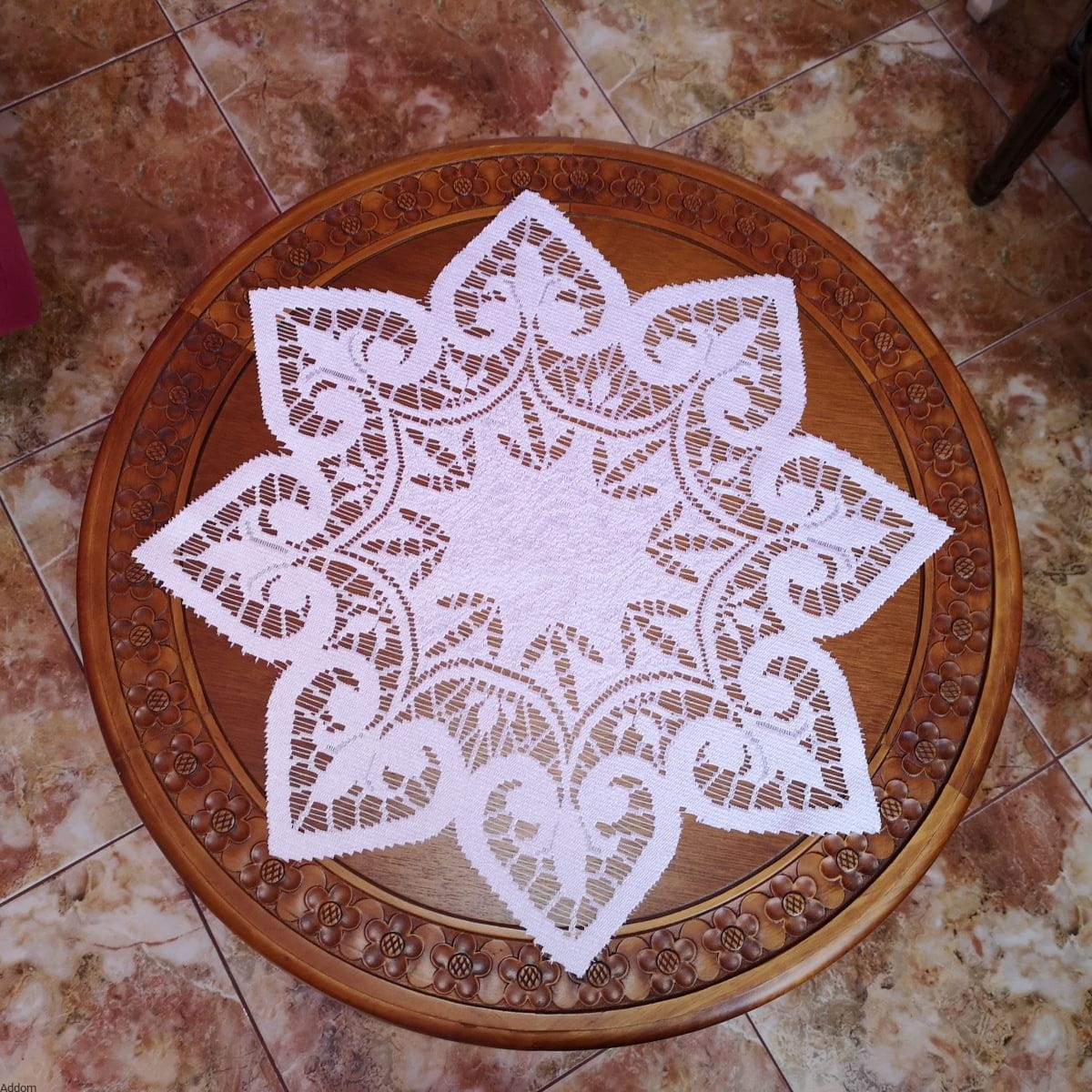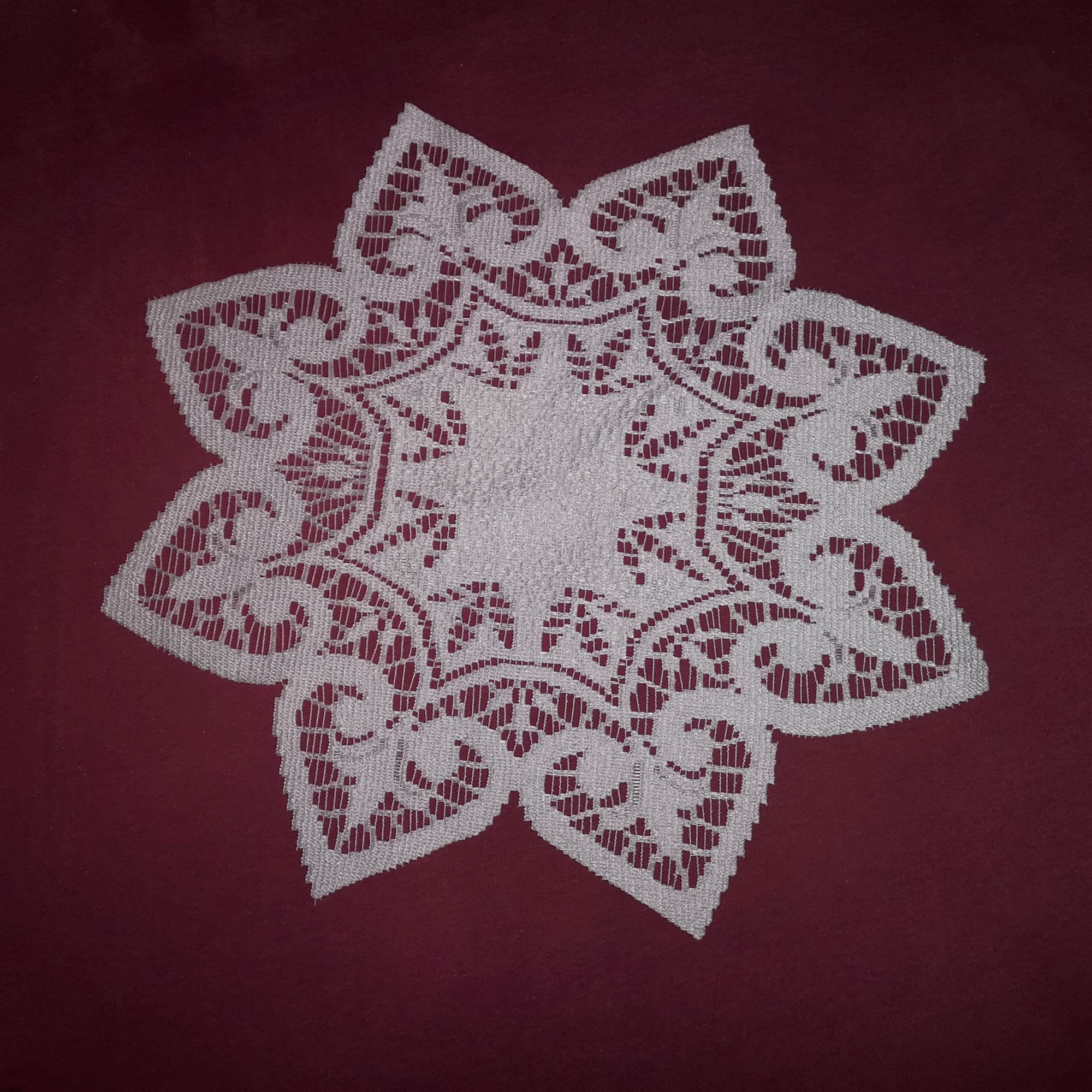 Serwety grube, najgrubsze, jakie są oferowane na rynku z żakardów. Jest to żakard polskiej produkcji, o gwiaździstym kształcie, o średnicy 40 lub 50 cm, a więc nadają się jako małe nablatowe obrusiki, do których nabyć można także bieżniki. Serwety są z żakardowe i grube, dobrze przylegają, są ciężkawe, białe. Płatki serwety wypełniają wzory lilijki.