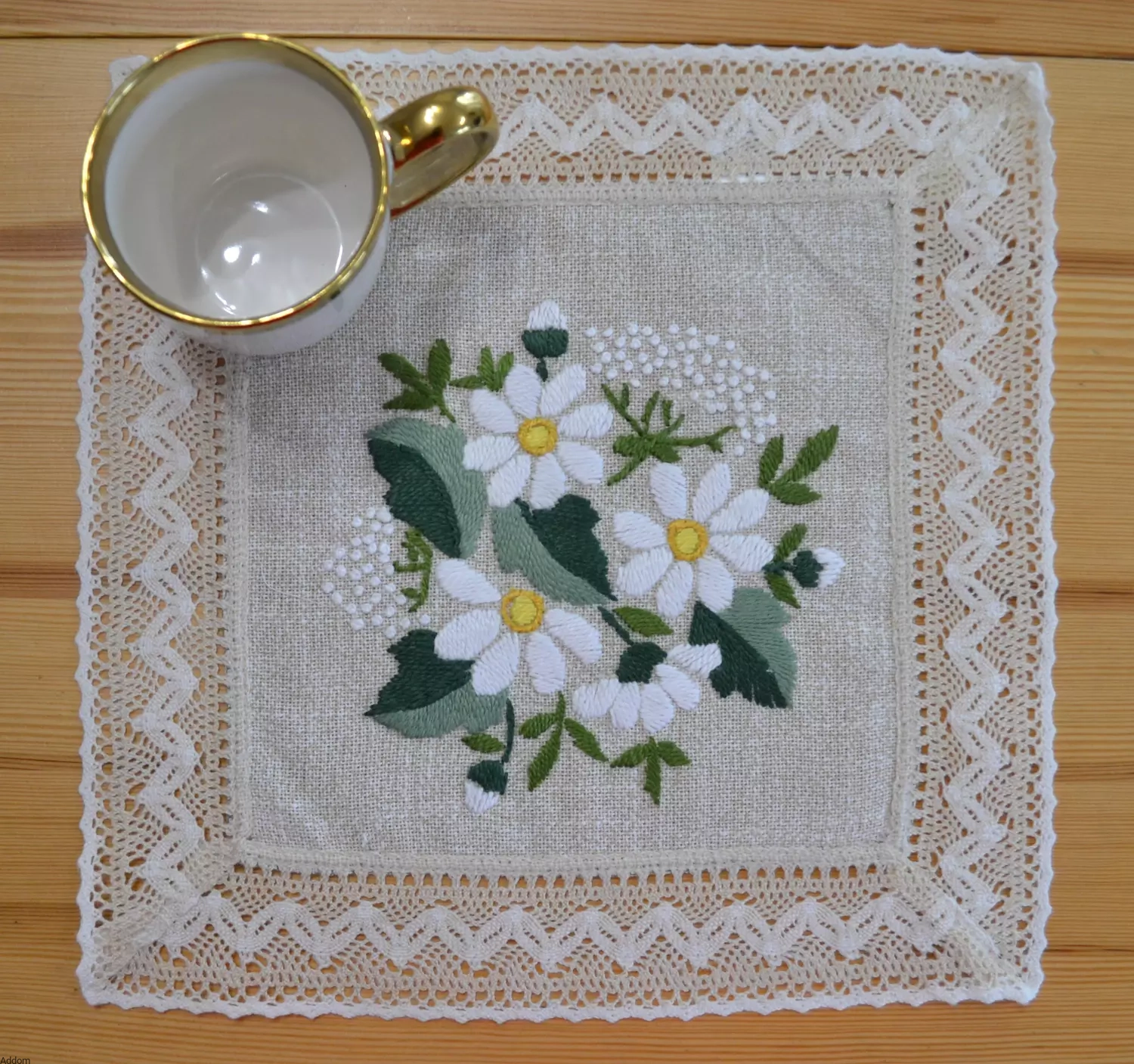 Lniane serwety z naszytą naokoło koronką bawełnianą. Tkanina lniana, z której zostały uszyte serwety zawiera naturalistyczny, kwiatowy haft. Serwetki są robótką ręczną, która idealnie uzupełni wystrój rustykalnego wnętrza lub przeznaczona na prezent, ucieszy każdą babcię.